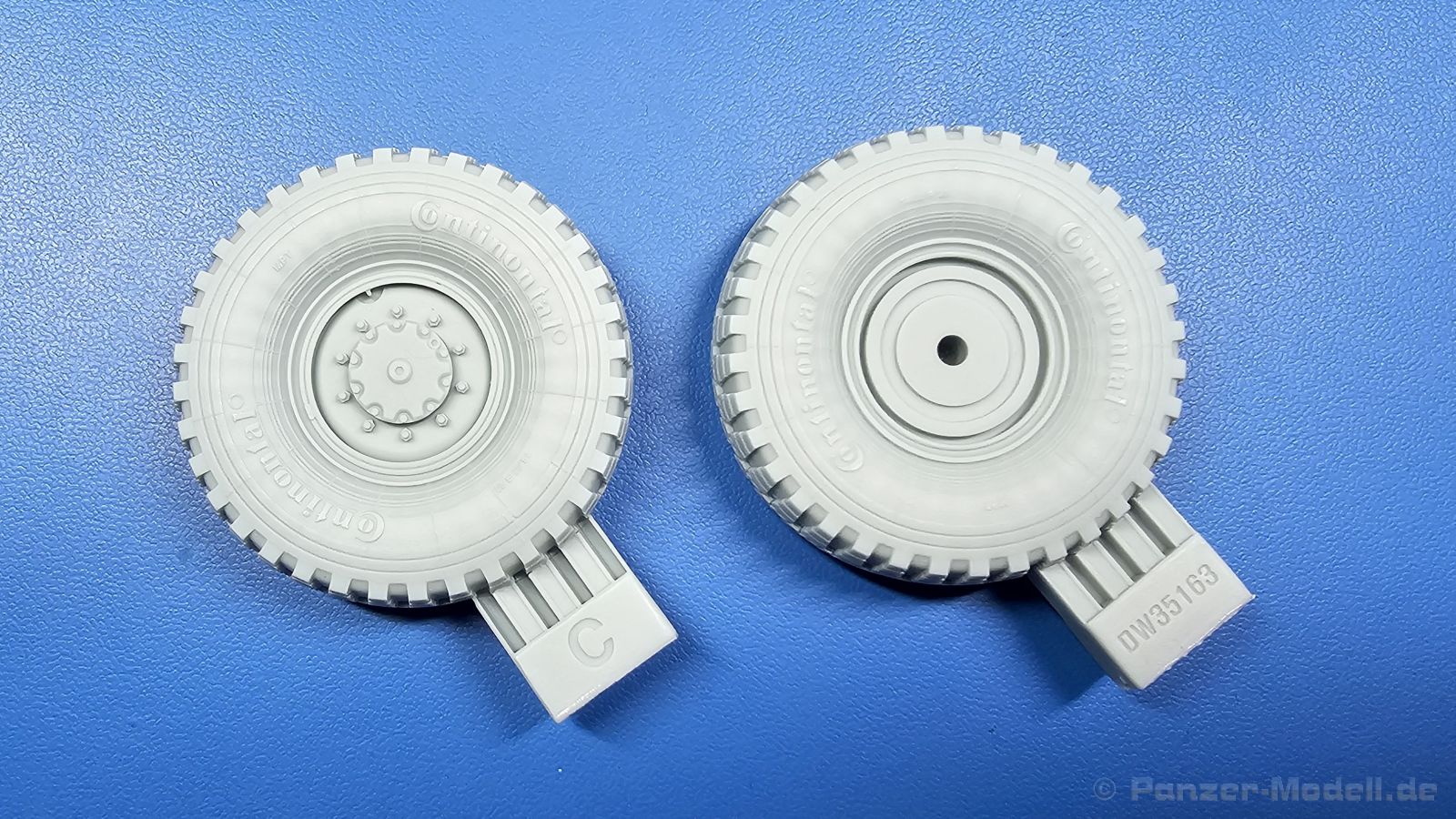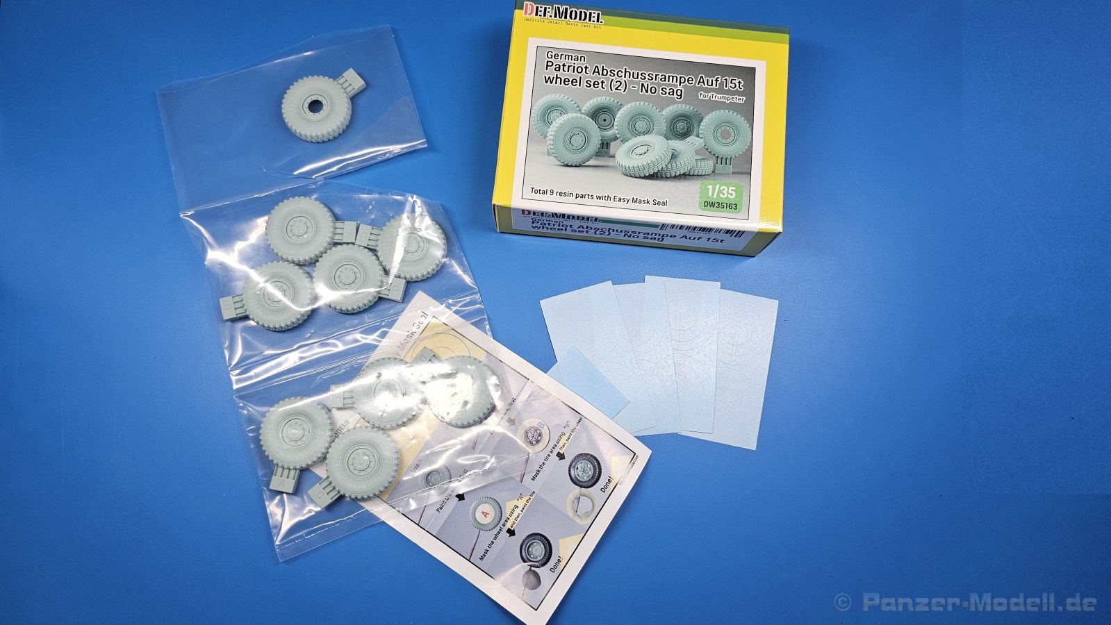 Wer den Trumpeter Bausatz 01088 Patriot Abschussrampe auf 15t mil gl Br A1 sein Eigen nennt und nicht das Risiko eingehen möchte, ob die Gummireifen spröde werden und reißen, der hat nun die Alternative, die Gummireifen durch Resin-Reifen von DEF.Model zu ersetzen. Im 140 x 110 x 40 mm großen Karton enthalten sind 9 Resinteile (8 Räder und 1 Ersatzrad) und ein Blatt mit Klebemasken. Natürlich hat DEF Model auch diesem Set gleich noch passende Lackierschablonen und eine Anleitung dazu beigelegt. Die Lackierschablonen sind selbstklebend und zweiteilig, sodass man sich entscheiden kann, ob man das Rad erst komplett Gummifarben lackiert und dann das Reifengummi abklebt für die Felgenlackierung oder andersrum. Wieder ein hervorragendes Set, das man gut empfehlen kann. Mit dem anderen Profil kann man seinem MAN Patriot den gewissen anderen Touch geben. In Deutschland liegt der Preis bei rund 32,- Euro.