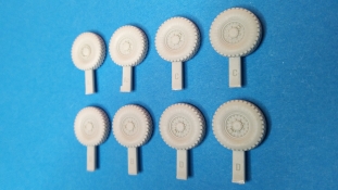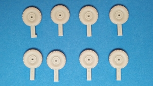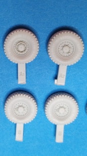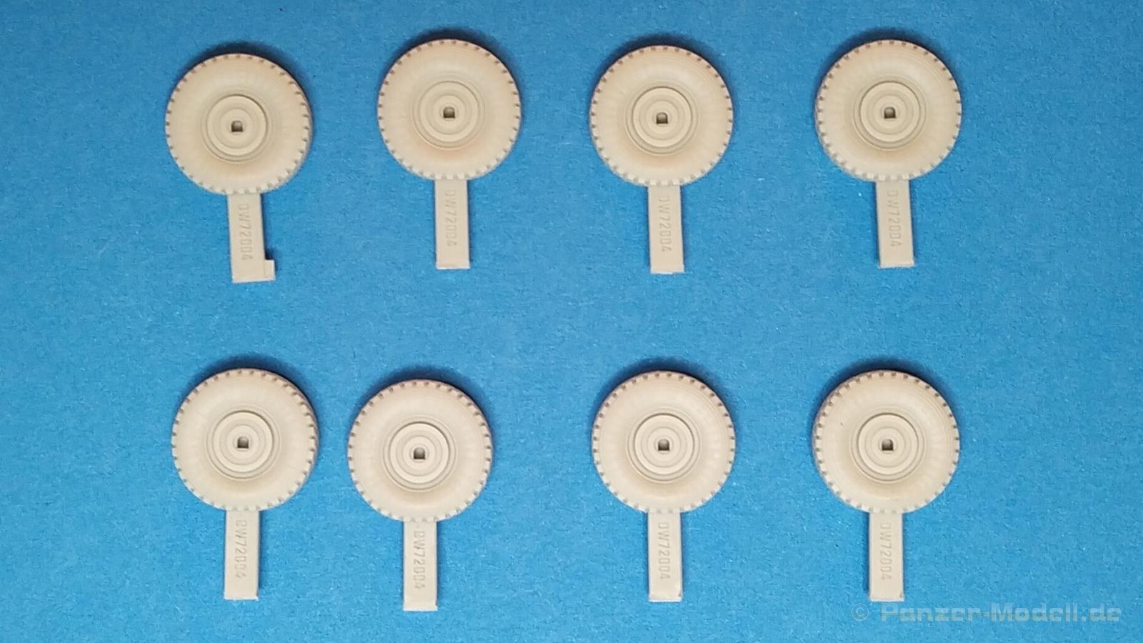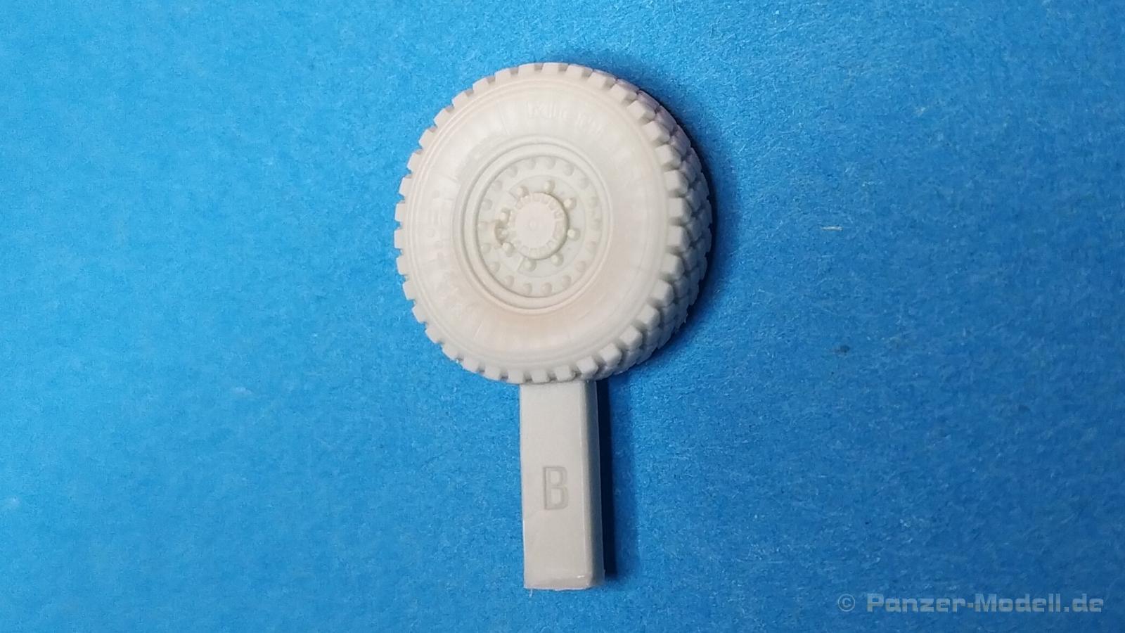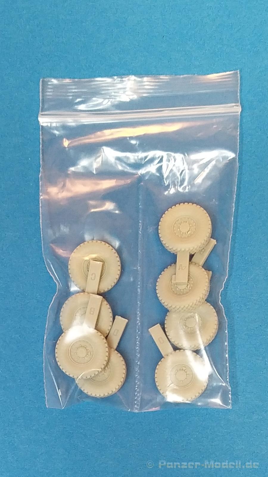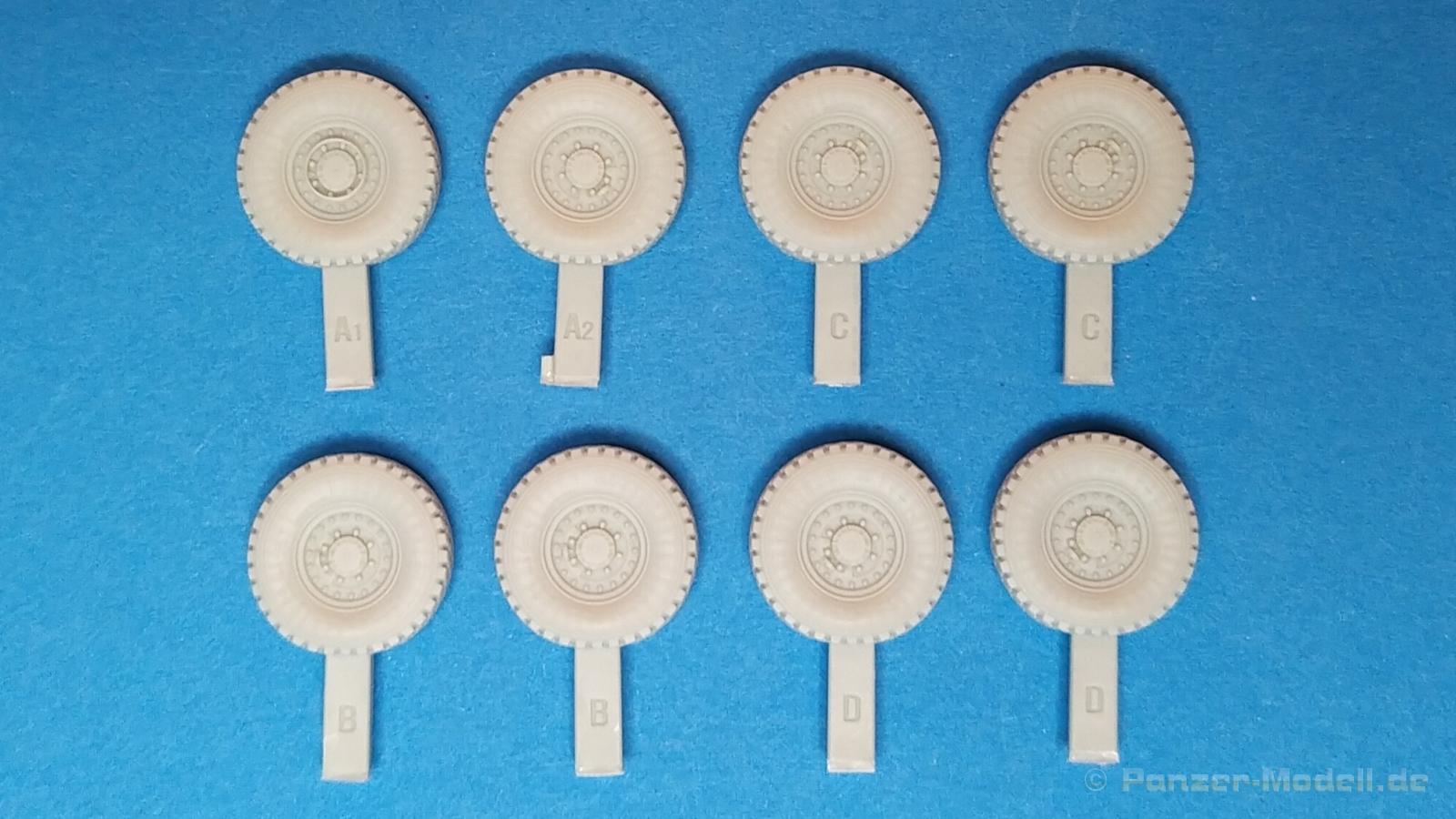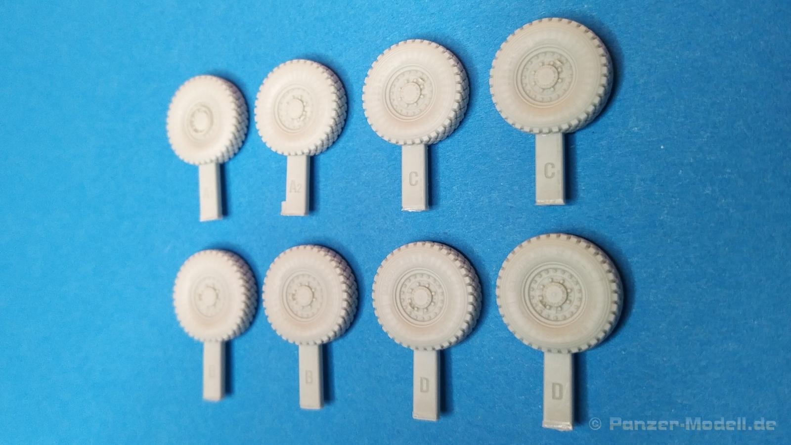 Der koreanische Hersteller DEF.Models ist bekannt für hochqualitatives Zubehör in verschiedenen Maßstäben. Im kleinen Maßstab erschienen zuletzt ein paar sehr schöne Rädersätze für moderne amerikanische Fahrzeuge. Unter der Nr. DW72004 ist ein Satz mit 8 Resin-Rädern vom Typ Michelin XZL 12.00 R20 für den M1126 Stryker im Maßstab 1:72 erhältlich. In einem kleinen farbigen Karton (8,0 x 5,5x 3,0cm) wird folgender Inhalt geliefert: - 1 zweiseitige Bemalanleitung Laut Hersteller sollen diese Räder für Bausätze von Academy und Dragon passen. Die Detailierung und Gravierung der Teile ist hervorragend. Der Clou ist die belastete Darstellung der Reifen mit der Abflachung an der Unterseite. Dies ist sehr realistisch wiedergegeben. Auch wurde an die Herstellerangaben auf den Reifenflanken gedacht. Das Profil ist sehr sauber gleichmäßig und scharkantig ausgeführt. Auch die Felgen wissen durch die feinen Verschraubungen und den filigranen Ventilschutzbügel zu überzeugen. Die Angüsse sind so an der Unterseite gewählt, dass man diese gut entfernen kann und keine später sichtbare Struktur zerstört. Der Resinguß ist tadellos. An der Rückseite sind die Achsaufnahmen mit Einkerbungen so gestaltet, das gewährleistet wird das das jeweilige Rad auch wirklich auf der abgeflachten Seite montiert wird. Bei den Rädern gibt es unterschiedliche Exemplare für links und rechts und auch an den „Aufstiegsring“ beim fahrerseitigen Rad wurde gedacht. Die beiliegende Bemalungsanleitung ist einsprachig englisch ausgelegt. Sie ist sehr übersichtlich aufgebaut. Auf der Vorderseite findet man eine detaillierte Darstellung zur Verwendung der Maskierschablonen für Reifen und Felge. Farbangaben werden nicht aufgeführt. Hier kann der Modellbau frei wählen. Auf der Rückseite sind Angaben über weitere verfügbare Zubehörsätze des Herstellers zu finden. Die Maskierschablonen kommen auf hellblauem Papier daher, wo insgesamt 9 vorgestanzte Schablonen zu finden sind. Mein Fazit: Einen sehr fein detaillierten Rädersatz präsentiert uns DEF.Models hier im kleinen Maßstab 1:72. Der Preis ist sicherlich nicht ganz günstig aber für die Detaillierung und Qualität absolut ok. Diese Räder sorgen bei den Grundbausätzen von Academy und Dragon für ein hohes Maß an Detailierung und Realität. Die Reifenabflachung und das sehr schön gestaltete Profil rechtfertigen den aufgerufenen Preis von 19,50 Euro für diesen Zubehörsatz und machen ihn daher zu einer absoluten Kaufempfehlung!