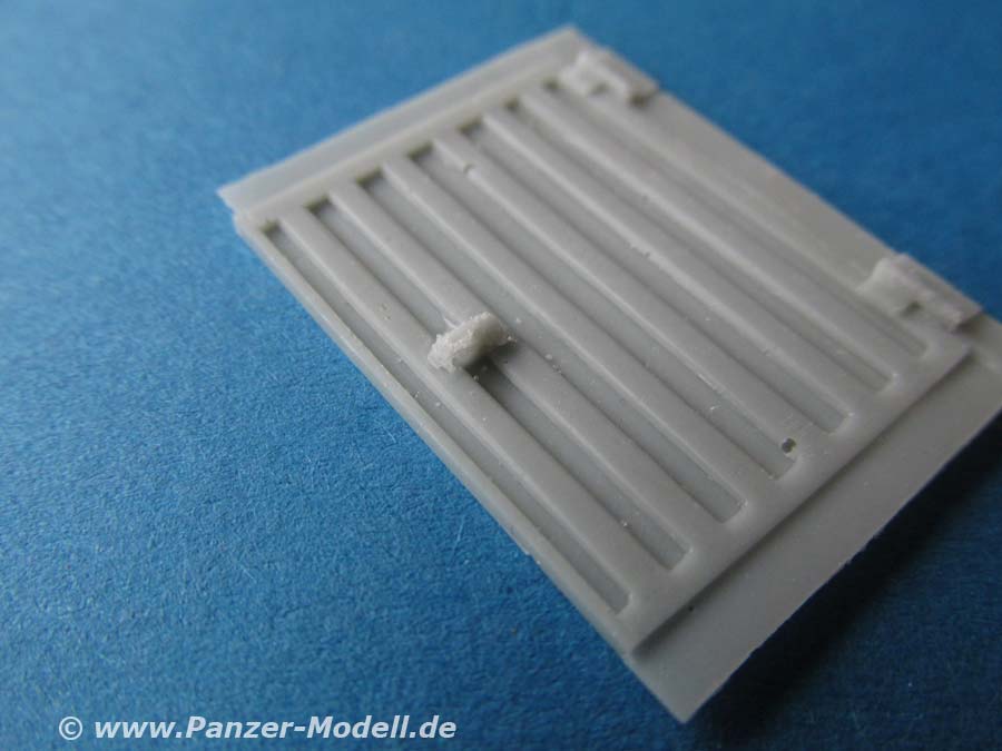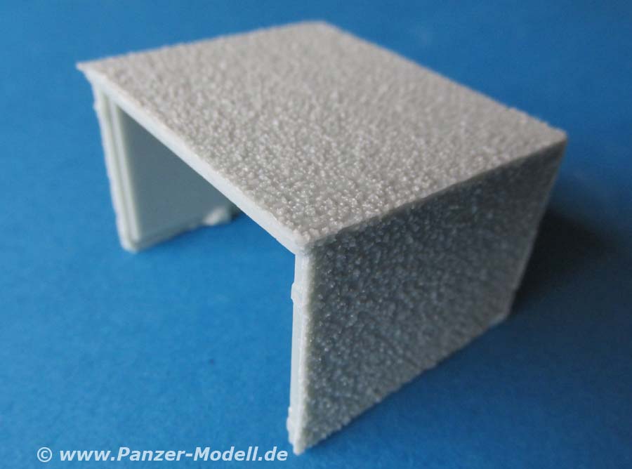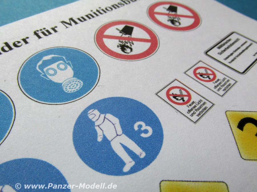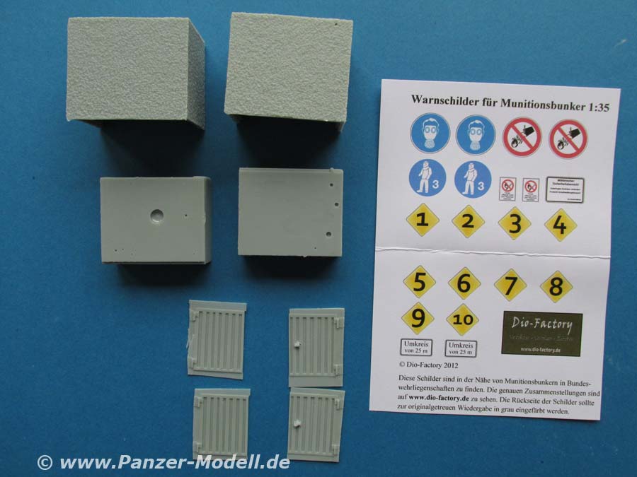 Im Karton finden wir insgesamt 8 Resinteile und einen A5 Bogen mit farbig gedruckten Zeichen zum Bau von insgesamt zwei kompletten Munitionsbunker, wie sie hauptsächlich in Bundeswehrliegenschaften zu finden sind Der Guss der Resinteile ist wirklich gut. Zwar zeigen sich in dem Guss der U förmigen Unterbauteile Luftblasen, aber diese Teile sind später nicht sichtbar, von daher absolut zu vernachlässigen. Die Qualität der übrigen Teile ist exzellent. Die Bunkerverkleidung, die in echt aus so etwas wie Waschbeton gemacht sind, ist wunderbar in grober, rauer Struktur gegossen. Die zweiflügeligen Türen sind ebenfalls sehr gut, denn zum einen sind diese realstisch dünn gegossen und auch die Struktur dieser ist sehr gut wiedergegeben. Eine Innenausstattung des Bunkers wie Einschübe oder Kisten ist nicht enthalten und muss ggf. bei offener Darstellung vom Modellbauer nach eigenem Gusto gestaltet werden. Zur Vervollständigung der Bunker liegt dem Set ein sehr schön und fein gedruckter Bogen mit entsprechenden Warnschildern bei. Der Druck ist sauber auf mattem Papier ohne jegliche Druckfehler wie Rasterung oder Streifenbildung. Bei Versiegelung mit seidenmattlack ergibt sich hier sicher ein perfektes Finish. Natürlich müssen die Schilder noch entsprechend sauber ausgeschnitten werden. Insgesamt bekommen wir hier ein tolles Set mit guter Ausstattung und Qualität der Gussteile. Für rund 14 Euro bekommt der geneigte Modellbauer ein schönes Set um diese besonderen Stücke in Dioramen einzusetzen.