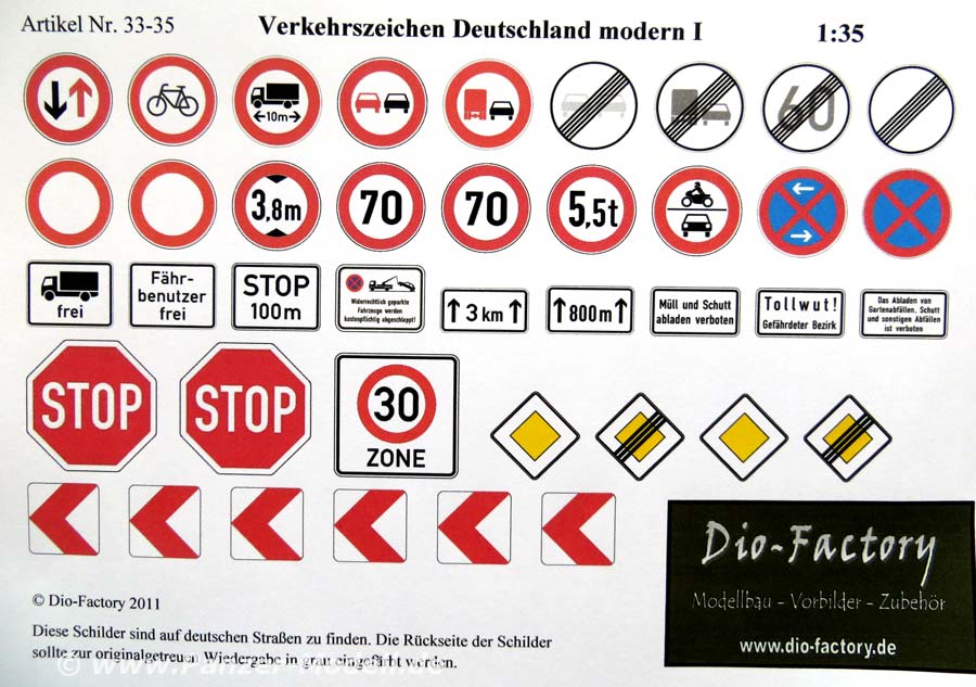 Die Auswahl der Schilder ist sehr gut und lässt dem Modellbauer viele Möglichkeiten. Vorfahrtsstraßen, wie auch Stoppschilder sind enthalten wie Geschwindigkeitsbegrenzung 70, Überholtverbot, Aufhebungszeichen, Halteverbote, Durchfahrtsverbote, usw.