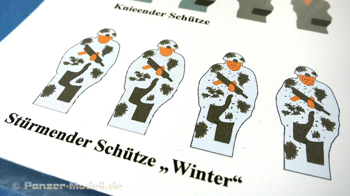 Insgesamt sind 21 Schießscheiben enthalten von 5 verschiedenen "Kameraden", wie den liegenden Schützen, den MG Schützen, den knieenden Schützen und jeweils stürmende Schützen Sonner und Winter - wobei mir die Winterversion nie untergekommen ist.
