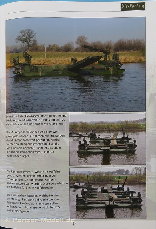 Das Heft beginnt mit 3 Seiten Text zu Entwicklung und Einsatzmöglichkeiten der M3 Amphibie, die Technik und Bauteile, Einsatz, Ablauf eines Brückenschlags und die Gliederung.