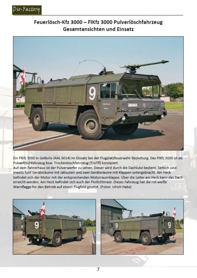 Dio-Factory ist ja bereits bekannt durch sein Diorama-Zubehör und Foto-CDs, speziell auf das Thema Bundeswehr zugeschnitten. Vor einer Weile startete die WalkAround Serie und heute halte ich das zweite Heft in der Hand. Wie schon das erste, geht es nicht um Fahrzeuge „von der Stange“, sondern um ein paar besondere - die Faun Feuerlösch-Kfz 3000 (2-achsig), 3500 (3-achsig) und 8000 (4-achsig), die von der Bundeswehr als Flugfeldlöschfahrzeuge eingesetzt wurden, bzw. noch werden. Als WalkAround erwartet man viele Bilder und das 82-seitige Heft im A4-Format enttäuscht nicht. Es gibt viel auf die Augen - 323 Bilder, die, bis auf 4 Aufnahmen von Vorserienfahrzeugen, durchweg farbig und meist auch gestochen scharf sind. Auch wenn die Bilder für sich sprechen, gibt es reichlich Erklärungen dazu. Die Themenblöcke sind, soweit möglich, für jedes Fahrzeug gleich gehalten, so dass man die Typen auch miteinander vergleichen kann. Die Überschriften geben da Auskunft: · Einleitung Faun Feuerlösch-Kraftfahrzeug (FlKfz) FlKfz 3000 - FlKfz 3500 - FlKfz 8000 Die Einleitung gibt Auskunft über den Fahrzeughersteller, warum man eine 2. Generation Feuerlöschfahrzeuge brauchte und einen Ausblick auf die 3. Generation. Es wird auch kurz auf die Unterstützungsfahrzeuge wie Einsatzleitfahrzeug und Unimog mit Pilotenrettungsbühne eingegangen. Für jedes der drei Fl.Kfz gibt es eine Beschreibung, unterstützt von einer Seitenansichtszeichnung und einem Datenblatt mit technischen Daten. Technik und Einsatz und Gesamtansichten und Einsatz zeigen sehr schöne Ausnahmen der Fahrzeuge in Gänze. Interessant dabei ist auch die Farbgebung, die von einfarbiger Tarnfarbe über NATO-3-Farb- und Afghanistan-Tarnung bis hin zum Feuerwehr-Rot geht. Dabei ist von frisch lackiert bis hin zum verblichenen Lack alles dabei. Mich hat es fasziniert zu sehen, dass die feuerwehrroten Fahrzeuge am Rahmen und im Innenraum dennoch das militärische Grün tragen. Die Detailansichten gehen weit ins Eingemachte und zeigen nicht nur einen Blick auf die Armaturen im Fahrerhaus, sondern auch hinter fast jede Klappe und auf die verwendete Löschausrüstung. Die Ausbildungsfahrzeuge, die erstaunlicherweise doch sehr von den Einsatzfahrzeugen abweichen, beschließen das Heft. Für mich ein Heft mit Wow-Faktor. Sicherlich interessant nicht nur für technisch interessierte und Feuerwehrleute! Die Fahrzeuge in ihren kantigen Ansichten machen schon echt was her, die Präsentation im Heft in der Mischung aus Fotos und Erklärungen ist toll. Modellbauer im kleinen Maßstab finden hier klasse Vorlagen zur Bemalung und Scratch-Modellbauer haben massig Material, um solch ein Fahrzeug auf die Räder zu stellen. Möge sich noch ein Hersteller finden, der die Fahrzeuge auch im größeren Maßstab auf den Markt bringt, damit man alles umsetzen kann, was das Heft schon anbietet. Ich bin schon gespannt, was uns dann als nächstes WalkAround angeboten wird. Der Preis beträgt EUR 17,95 (zzgl. Versandkosten) direkt ab Dio-Factory. Vielen Dank an Sven Eckelkamp für die Zusendung des Musters!