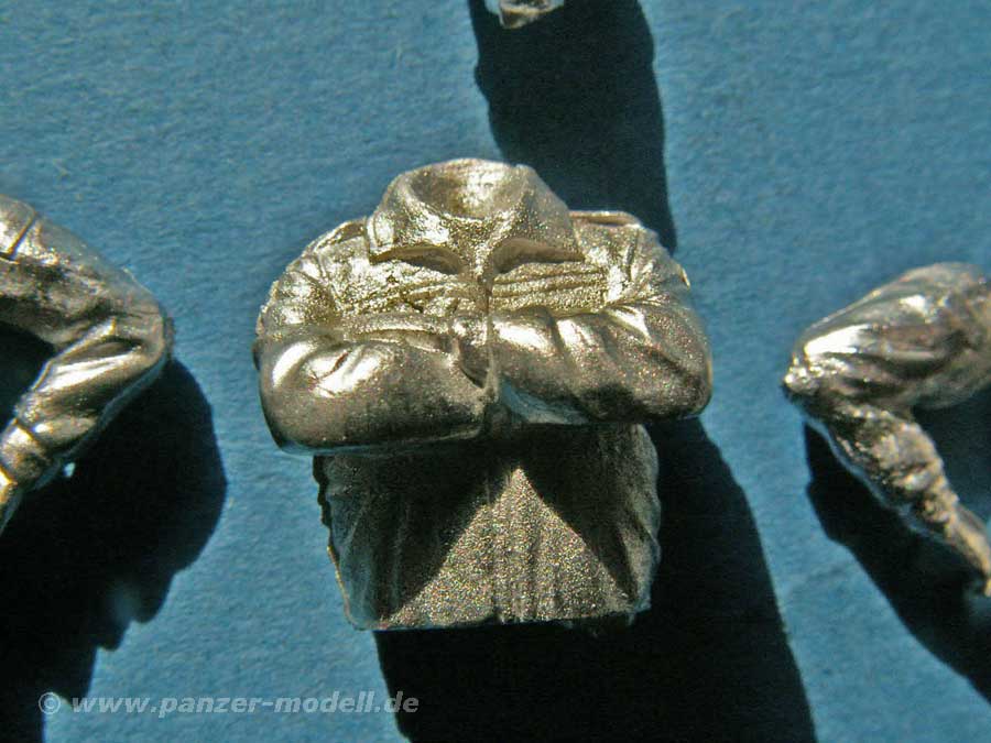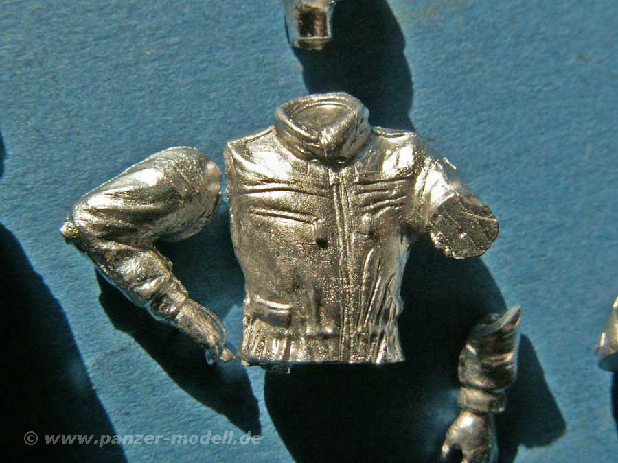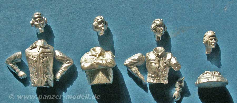 In diesem Set tummeln sich nun insgesamt vier Halbfiguren aus Zinn, die als Panzerbesatzung zum herausschauen aus Luken geeignet sind. Eine könnte man vielleicht sogar nur als Viertelfigur bezeichnen, da nur Kopf, Hals und Schultern dargestellt sind. Dies ist z.b. eine Fahrerfigur o.ä. die nur mit dem Kopf hevorschaut. Die anderen Figuren sind bis zum Koppel dargestellt und zwei mit separaten Armen, was eine Anpassung an Luken ermöglicht. Die Einsatzmöglichkeiten sind hier vielfältig. Die Qualität der Figuren ist für Zinnfiguren gut, hier und da ist die Oberfläche etwas rau oder das ein oder andere Detail etwas flächig wiedergegeben. Die Funkhaube und der Panzerkombi sind recht gut wiedergegeben und auch die Gesichter weisen Tiefe auf. Ein sinnvolles Set für die Besatzung von Bundeswehrpanzern.