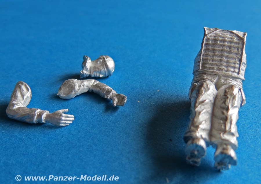 Die Position der Figur ist sitzend mit leicht angewinkelten Armen und Beinen und passt so direkt in den Bausatz des Eagle IV von Y-Modelle mit den Händen am Lenkrad.