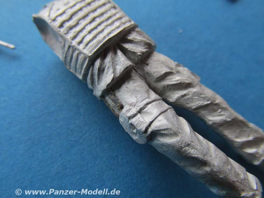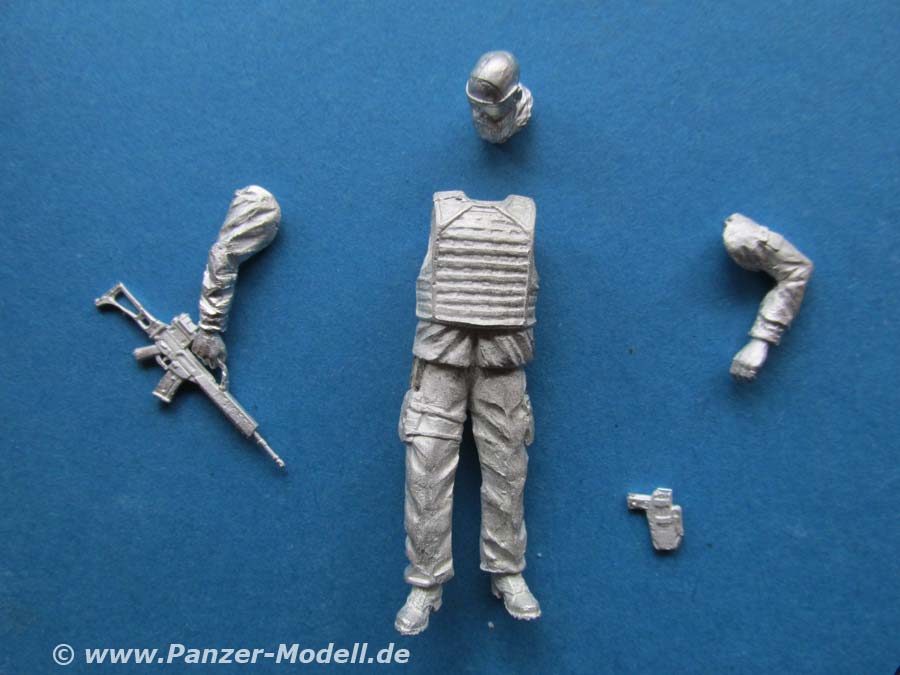 Arme und Kopf müssen einzeln an die Figur geklebt werden. Der Faltenwurf der Uniform ist schön und realistisch modelliert und wiedergegeben, wobei die Schutzweste wieder etwas sehr steif wirkt.