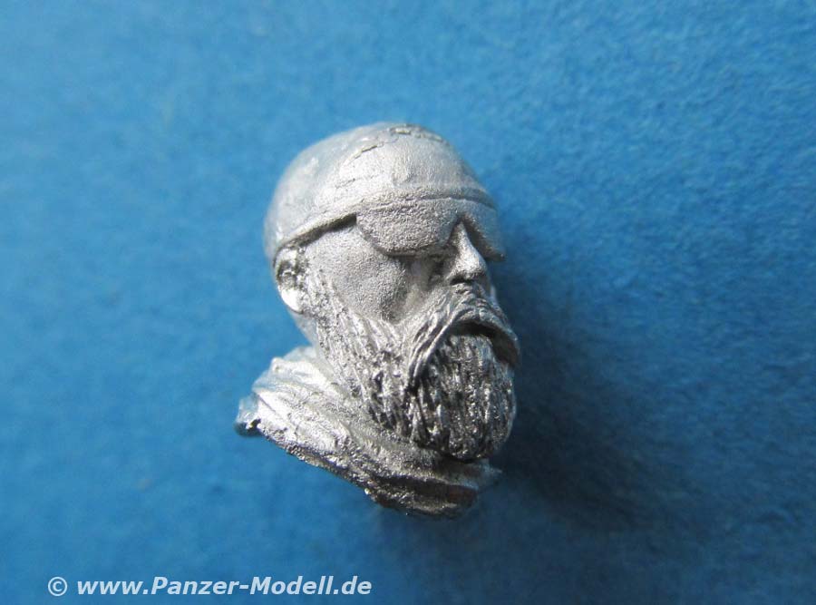 Der Kopf ist toll gemacht ohne Kopfbedeckung. Auch die Mimik des Gesichts mit den Details, der Brille und dem Bart sowie das Halstuch mit seinen Falten sind für Metallguss wirklich beachtlich gut gemacht.