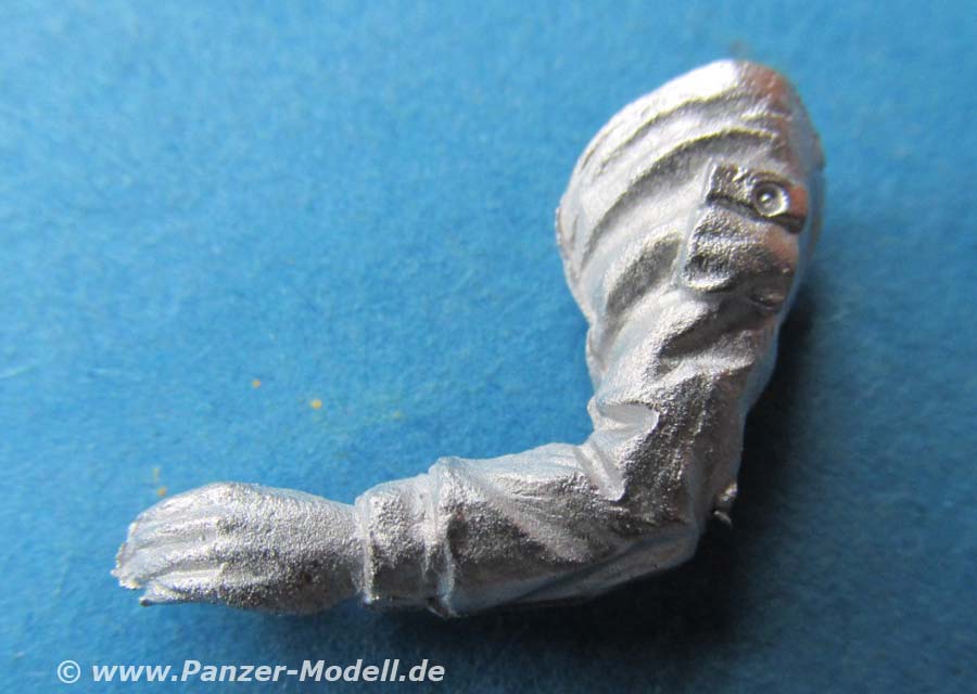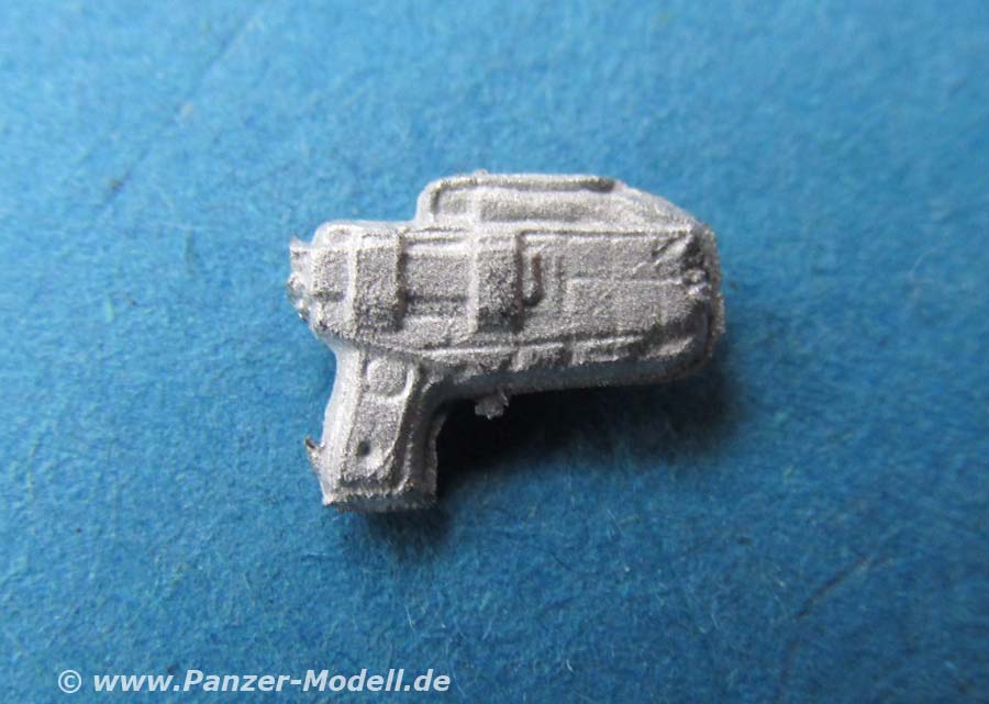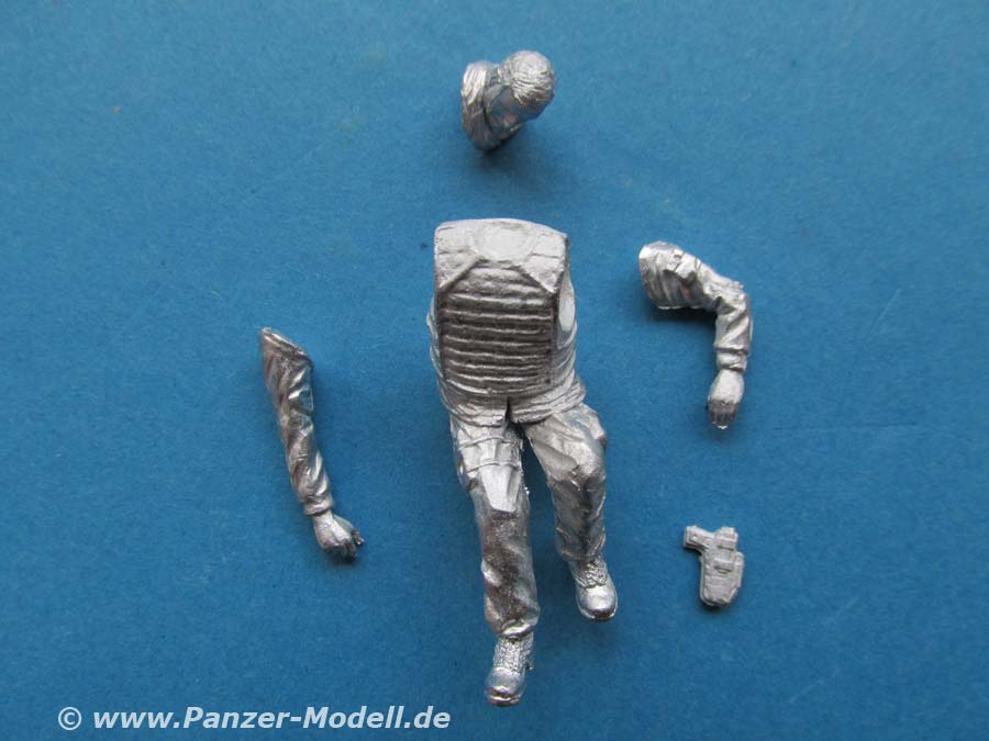 Arme und Kopf, sowie das Pistolenholster müssen einzeln an die Figur geklebt werden. Der Faltenwurf der Uniform ist schön und realistisch modelliert und wiedergegeben. Auch hier wirkt die die Schutzweste ein wenig steif.