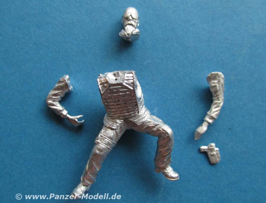 Arme und Kopf, sowie das Pistolenholster müssen einzeln an die Figur geklebt werden. Der Faltenwurf der Uniform ist schön und realistisch modelliert und wiedergegeben. Auch hier wirkt die die Schutzweste ein wenig steif.