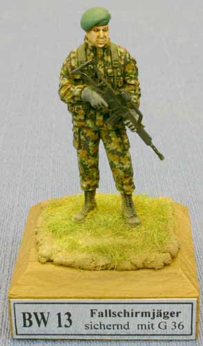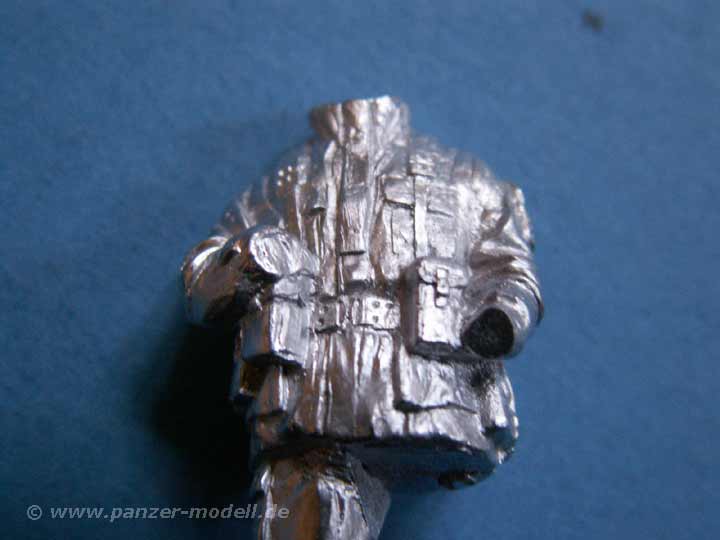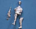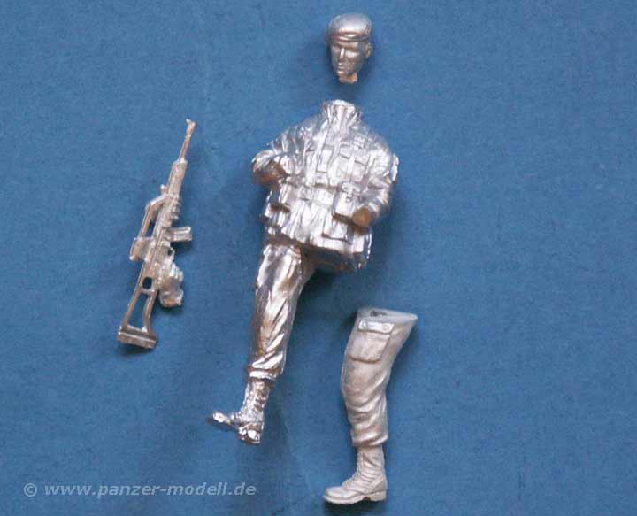 In diesem Set finden wir eine stehende/sichernde Figur, bestehend aus 4 Teilen. Die Arme und ein Bein sind direkt mit an den Körper angegossen - lediglich Kopf, das andere Bein und das Gewehr G36 mit anliegenden Händen sind als separate Teile beigefügt. Auch hier ist die Qualität der Teile ist recht gut - gerade die Ausführung der Kleidung gefällt gut. Der Kopf ist gut modelliert und trägt ein Barett. Das G36 ist auch recht fein und wie die ganze Figur aus Zinn gegossen.