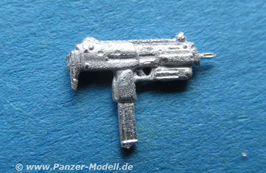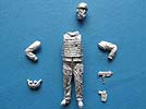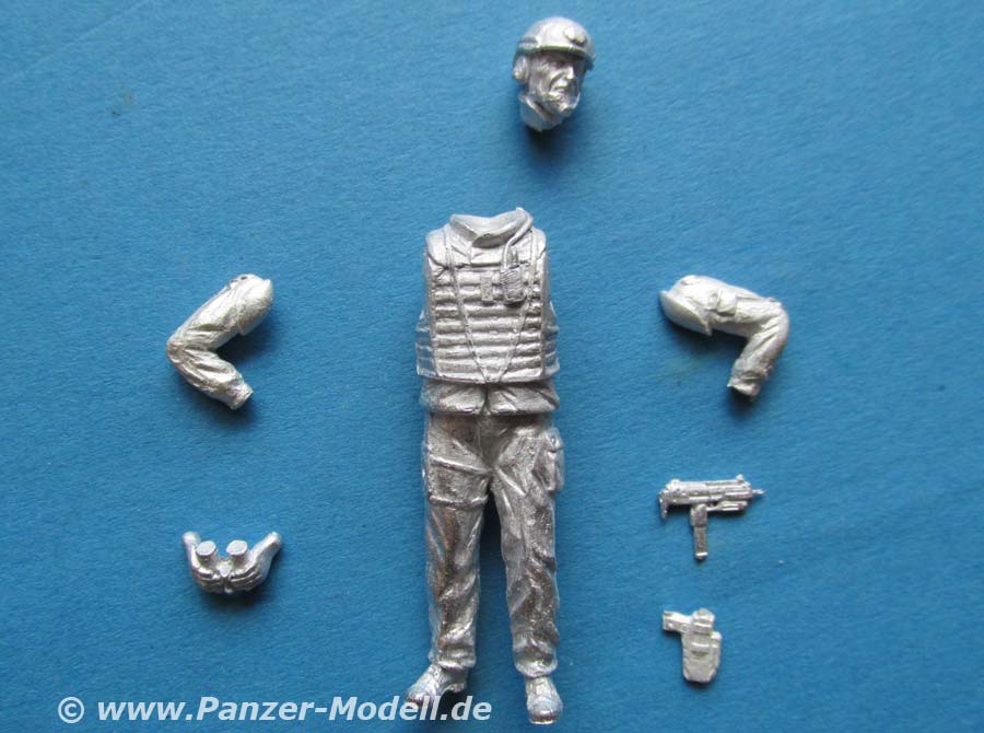 Arme und Kopf, müssen, wie gewohnt, einzeln an die Figur geklebt werden. Dazu kommen beide Hände zusammen mit Fernglas, die Pistole im Holster und eine MP7. Der Faltenwurf der Kleidung ist, sofern an Ärmel und Hosenbeinen sichtbar gut und realistisch modelliert und wiedergegeben. Die Schutzweste ist schön detailliert mit der typischen Struktur und am Hosenbein ist die P8 im entsprechenden Beinholster anzubringen. Die MP7 hingegen hängt vorn an der Einsatzweste