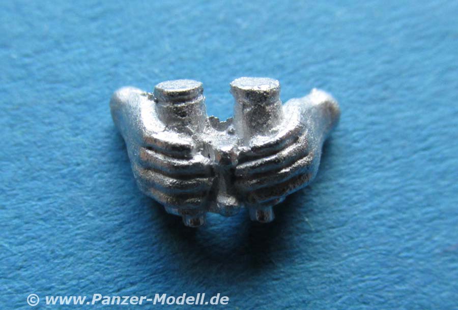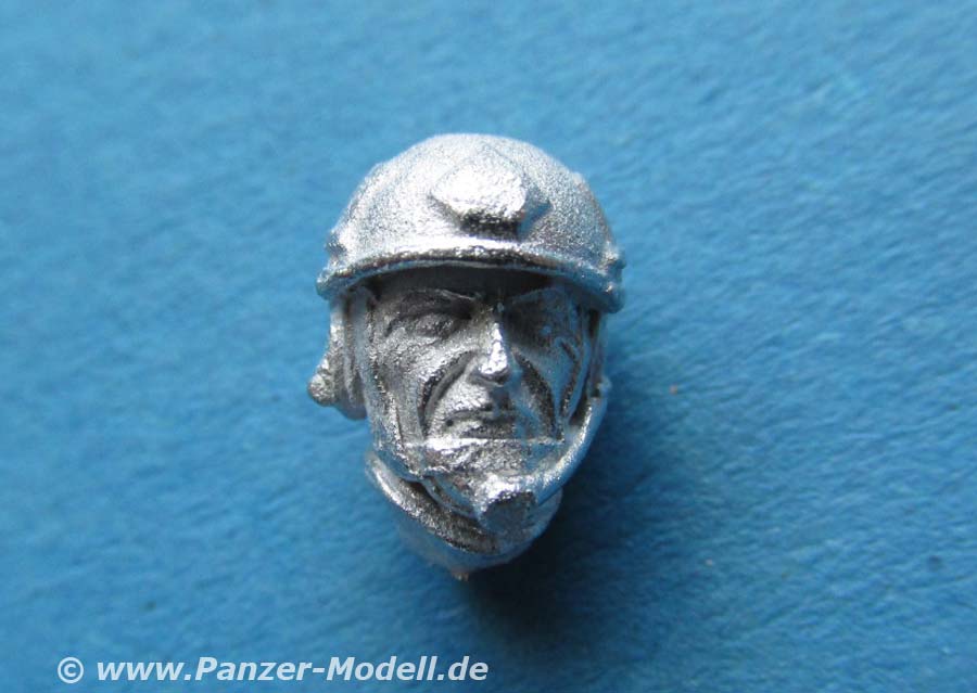 Der Kopf ist mit dem aktuell neuesten Helm der Bundeswehr ausgestattet mit anderer Form, leichter und mit eingebauter Halterung für Nachtsichtgeräte - die Details des Gesichts mit der Mimik und die Gestaltung der Kopfbedeckung sind für Metallguss wirklich gut gemacht. Es liegt in der Natur des Metallgusses, dass bei extremer Nahbetrachtung die Oberfläche rauh und unsauber aussieht.