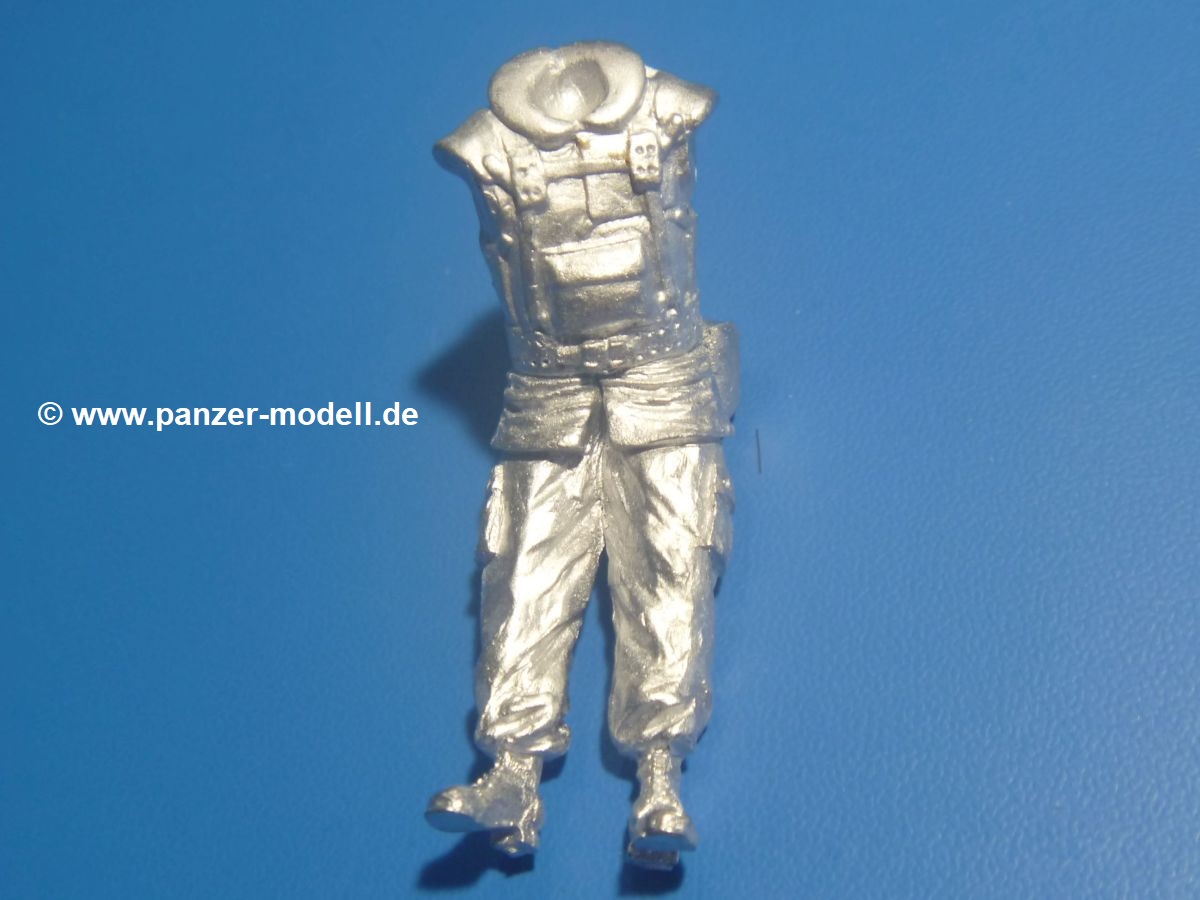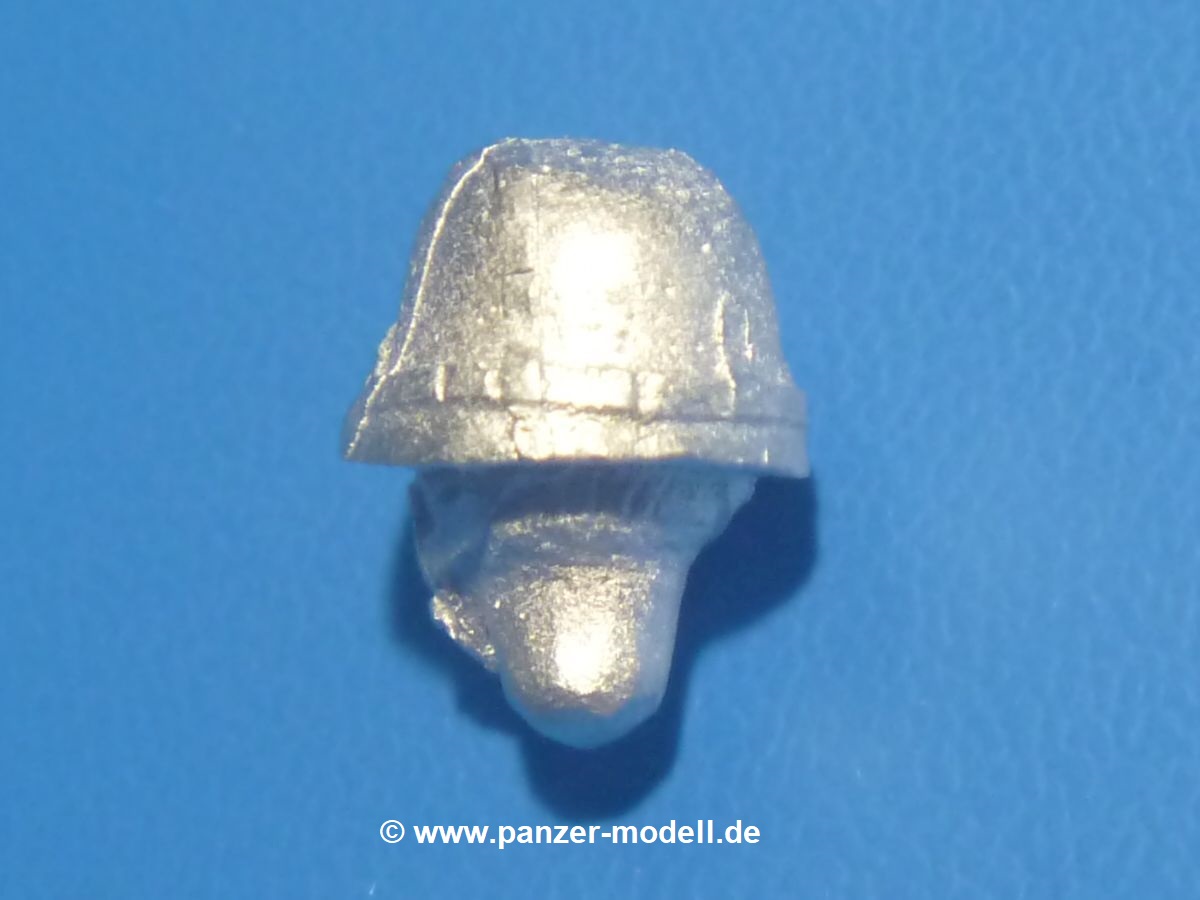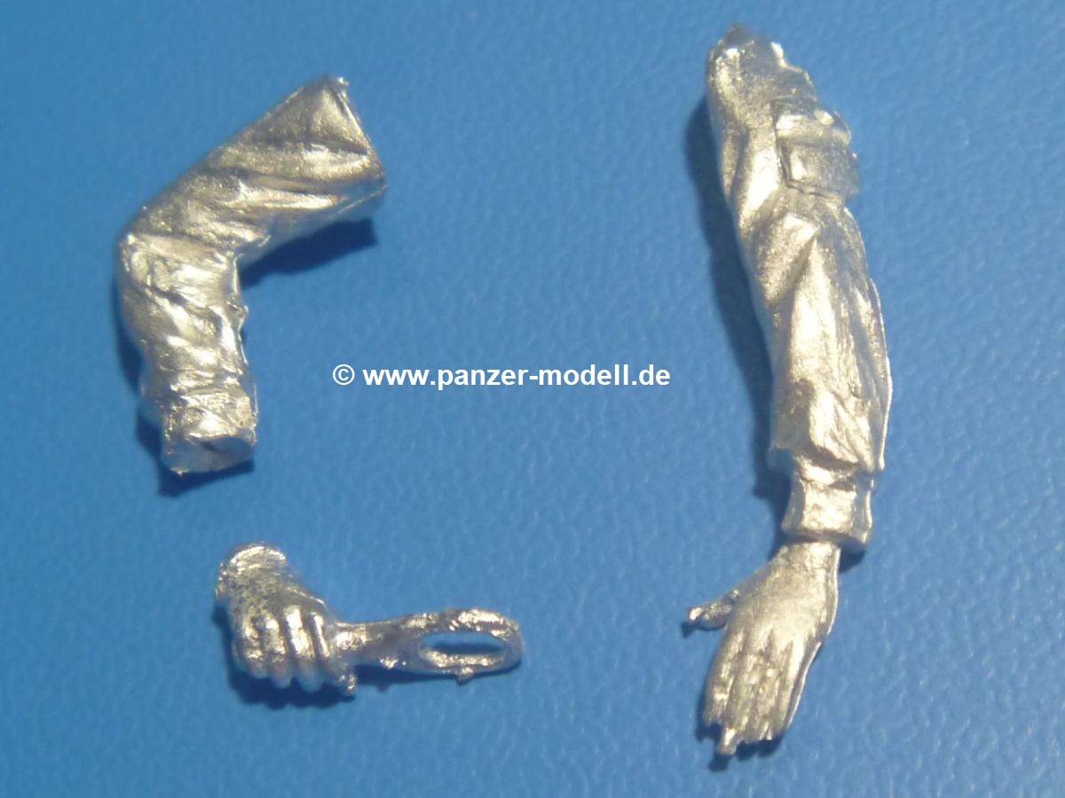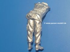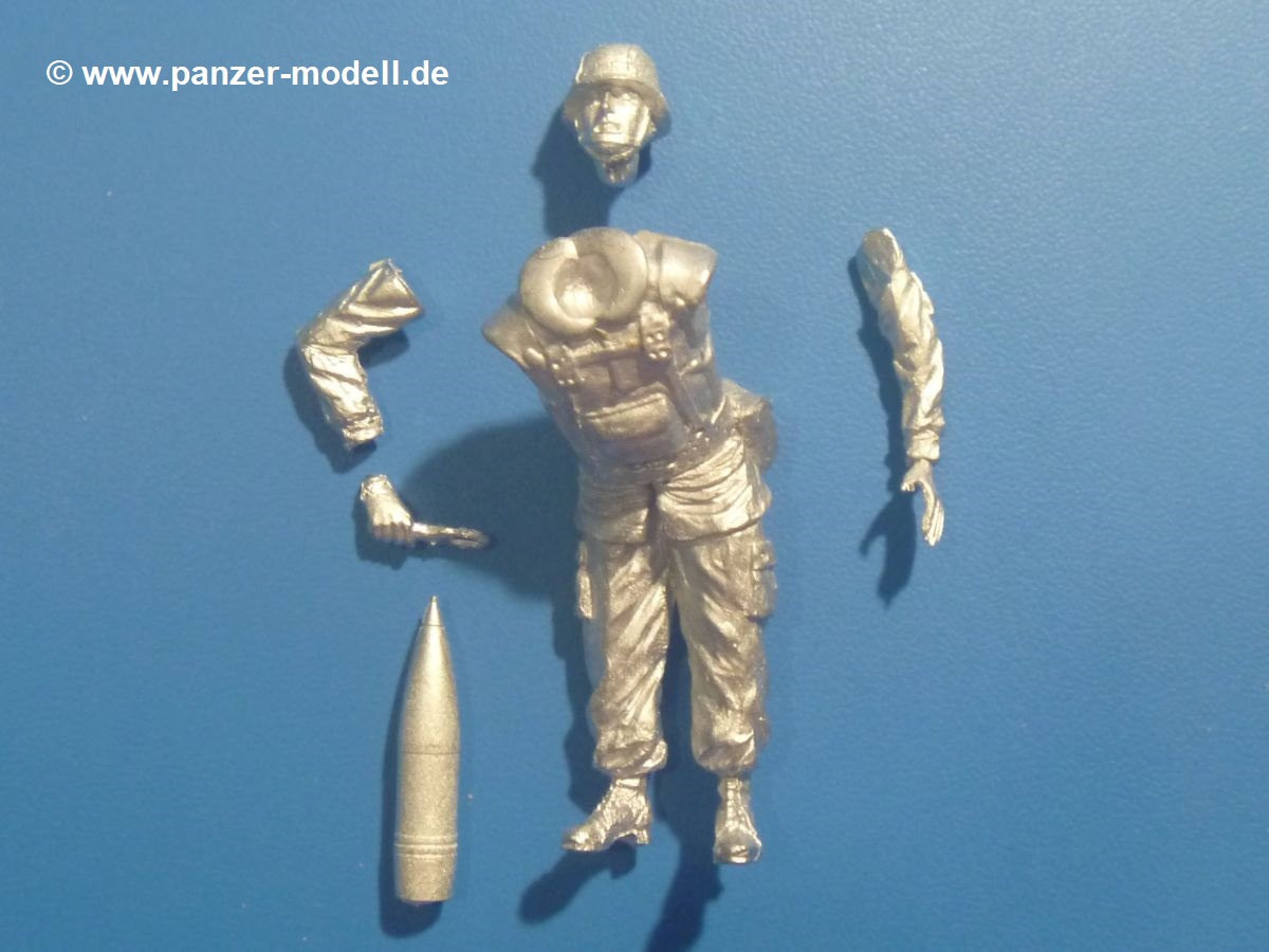 Diesmal betrachten wir den Munitionskanonier K5 beim Anziehen eines Zünders. Er trägt den Gefechtshelm zur Flecktarn-Uniform (ab ca. Mitte 1990-er) mit Splitterschutzweste, Koppeltragehilfe und Mehrzwecktasche wie seine anderen DOLP Kameraden. Wer bisher nur Resin- oder Plastikfiguren gebaut hat, wird sich bei Nahaufnahmen über die vergleichsweise raue Struktur wundern, die Metallguss eben so eigen ist. Dies wird aber nach Bemalung nicht mehr auffallen. Die Figur besteht aus 5 Teilen (Körper, Kopf, Arme, rechte Hand mit Zünderwerkzeug). Dazu kommen eine 155 mm Granate. Alles ist sauber gegossen. Es fallen nur minimale Versäuberungsarbeiten an. Auch hier ist die Figur eine gelungene Wiedergabe seines Vorbildes. Die Gesichtszüge sind gut erkennbar, der Gefechtshelm mit geteiltem Kinnriemen schön herausgearbeitet. Die Uniform überzeugt mit den Aufsetztaschen und gelungenem Faltenwurf. Am Koppel finden wir die genietete Doppelreihe an Befestigungslöchern für Ausrüstungsgegenstände, die Splitterschutzweste macht mit ihrem typischen Kragen und den Schulterflügeln auf sich aufmerksam. Die Kampfstiefel haben ordentliche Absätze, die Verschnürung ist deutlich erkennbar. Der linke Arme ist fast ausgestreckt, um das Zünderwerkzeug führen zu können. Rechter Arm und die Hand mit dem Zünderwerkzeug sind als separate Teile beigelegt. So kann man das Werkzeug entsprechend zum Zünder der stehenden Granate besser ausrichten. Ich weiß, ich wiederhole mich - die Figur ist ein sehr gutes Mittel zur Belebung der FH-70. Für 9,00 EUR kann man sie in Deutschland erstehen. |