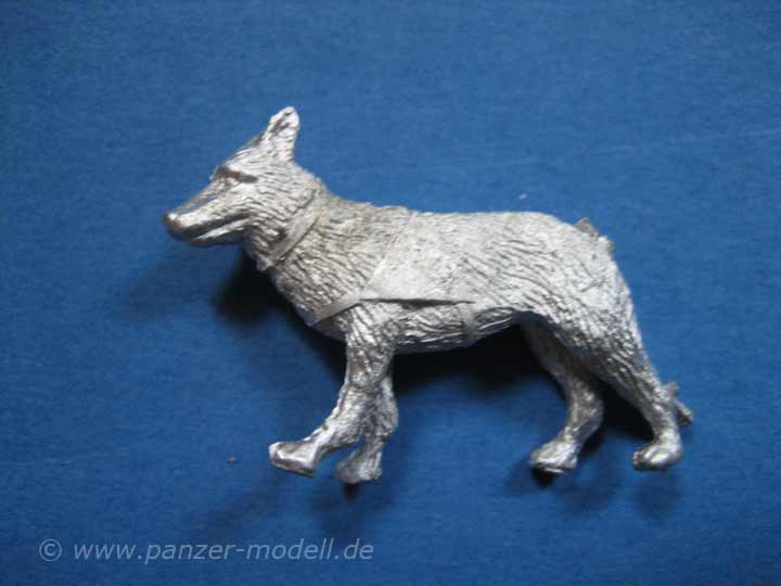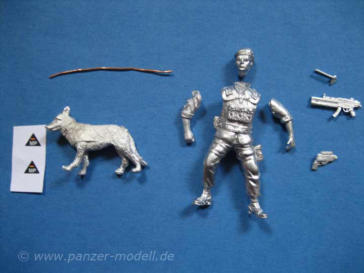 Ebenfalls enthalten hier ein Stück Draht als Leine, 'MP'Abzeichen und natürlich die dementsprechende Hundefigur. Diese ist exzellent gestaltet mit erkennbarer Fellstruktur.