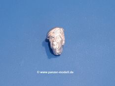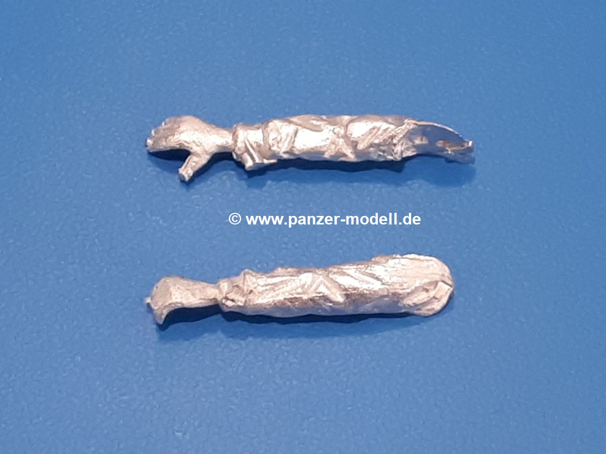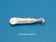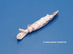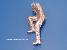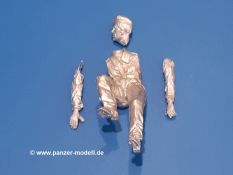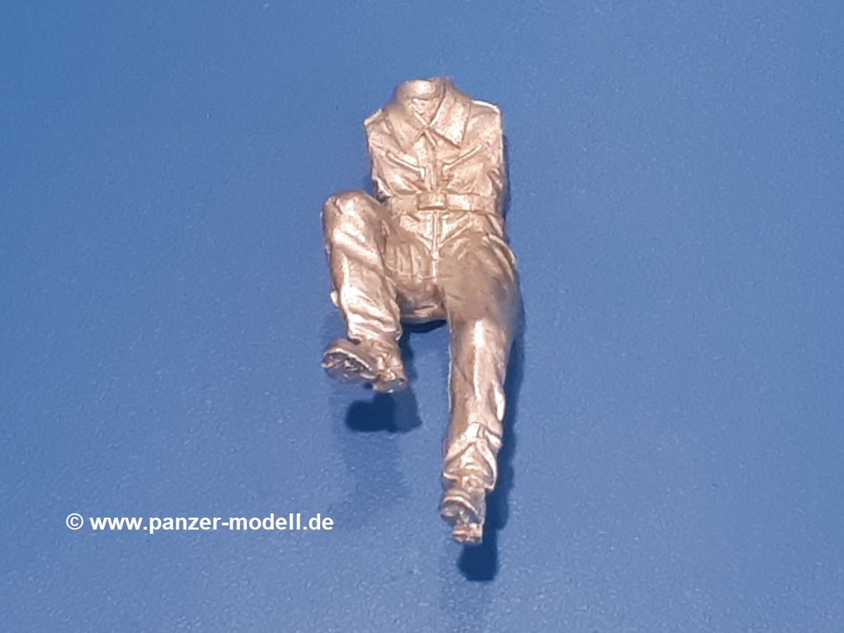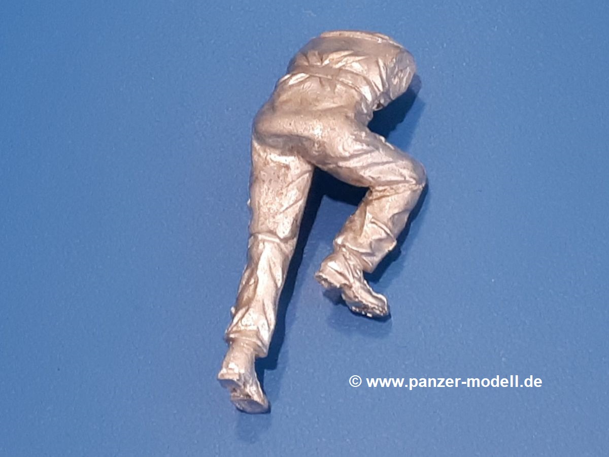 Dieser Panzersoldat steigt an der rechten Turmseite auf den Panzer. Er hält sich mit beiden Händen am Handgriff des Turmes fest, während er mit dem rechten Fuß auf die Kette tritt und der Linke in der Luft hängt. Anhand der DOLP Modellfotos erkennen wir, dass die Figur für einen frühen Leopard 1 ohne Ketten-/Turmschürzen vorgesehen ist. Die Figur besteht aus dem Körper, Kopf und separaten Armen. Sie trägt eine Panzerkombi mit Schulterklappen. Am Rücken findet man den Klettverschluss zum Bergegriff. Die Öffnungen der Brust-, Hüft- unter Unterschenkeltaschen sind deutlich zu erkennen, ebenso wie die langen Schiebergriffe zum Öffnen/Schließen der Reißverschlüsse. Über der Kombi wird in diesem Fall das Koppel getragen. Die Hosenbeine der Kombi ragen über die Stiefel, wie es bei den anderen Figuren bereits zu sehen ist und offiziell korrekt war. Der Kopf trägt das Barett der Panzertruppe mit einem angedeuteten Emblem. Das Gesicht ist individuell und gut gestaltet. Die Arme sind ausgestreckt, um den Handgriff am Turm zu fassen. Die Oberfläche weist eine leicht raue Struktur auf, die Metallguss so eigen ist, aber nach Bemalung wird das nicht mehr auffallen. Der Faltenwurf und die Oberflächendetails sind recht schön, wenn auch stellenweise etwas weich. Hier und da findet sich feiner Gussgrat, der sich leicht entfernen lässt. Eine weitere tolle Figur, um einen Leo 1 Bausatz zu beleben. Auf dem deutschen Markt ist sie für ca. 9 EUR zu bekommen.Eine tolle Figur, die einem Leo 1 Bausatz mehr Leben einhaucht. Sie ist für ca. 9 EUR auf dem deutschen Markt erhältlich. |