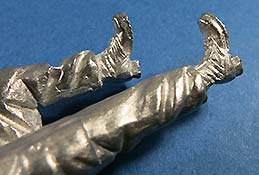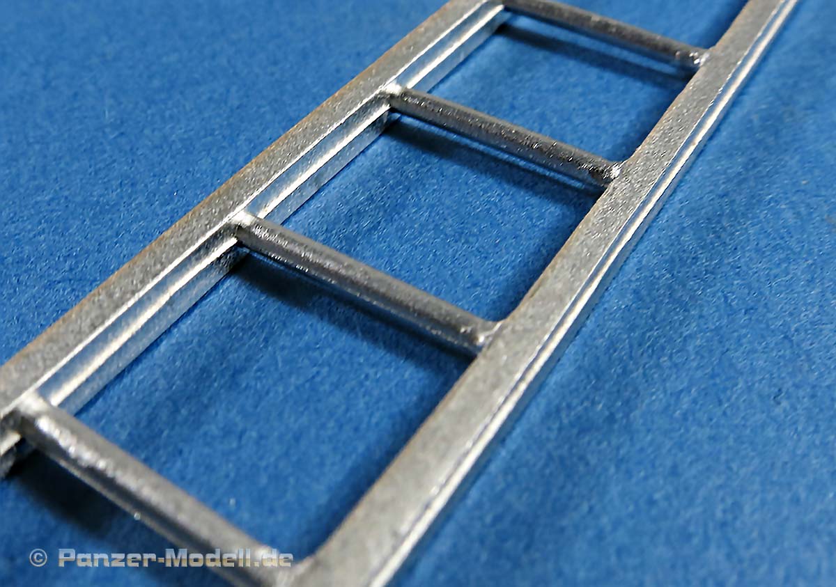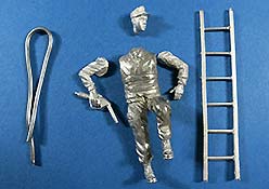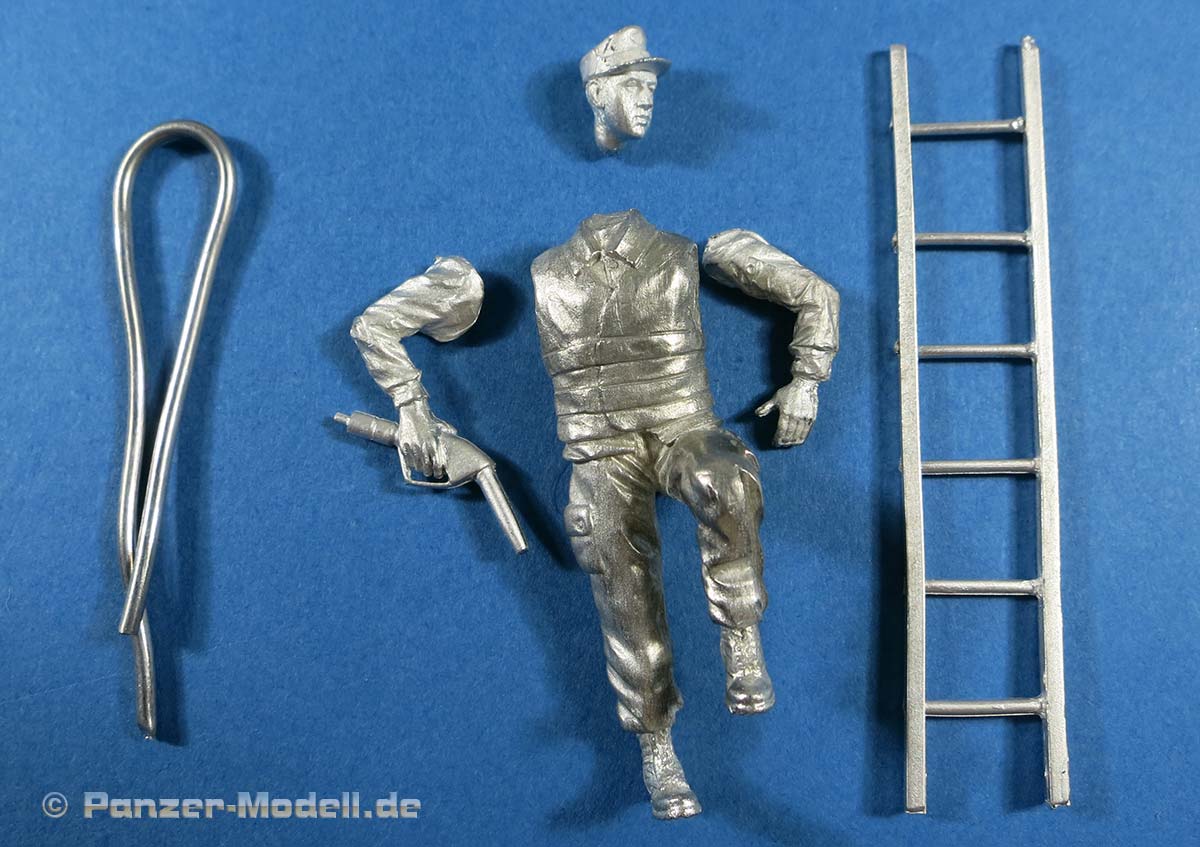 In der Packung finden wir insgesamt 6 Metallteile zum Bau einer Figur, die aus dem Gesamtkörper plus zwei Armen und dem Kopf besteht. Dazu eine Leiter und ein Stück Tankschlauch aus Metall. Der Tankstutzen ist bereits an die rechte Hand mit angegossen.