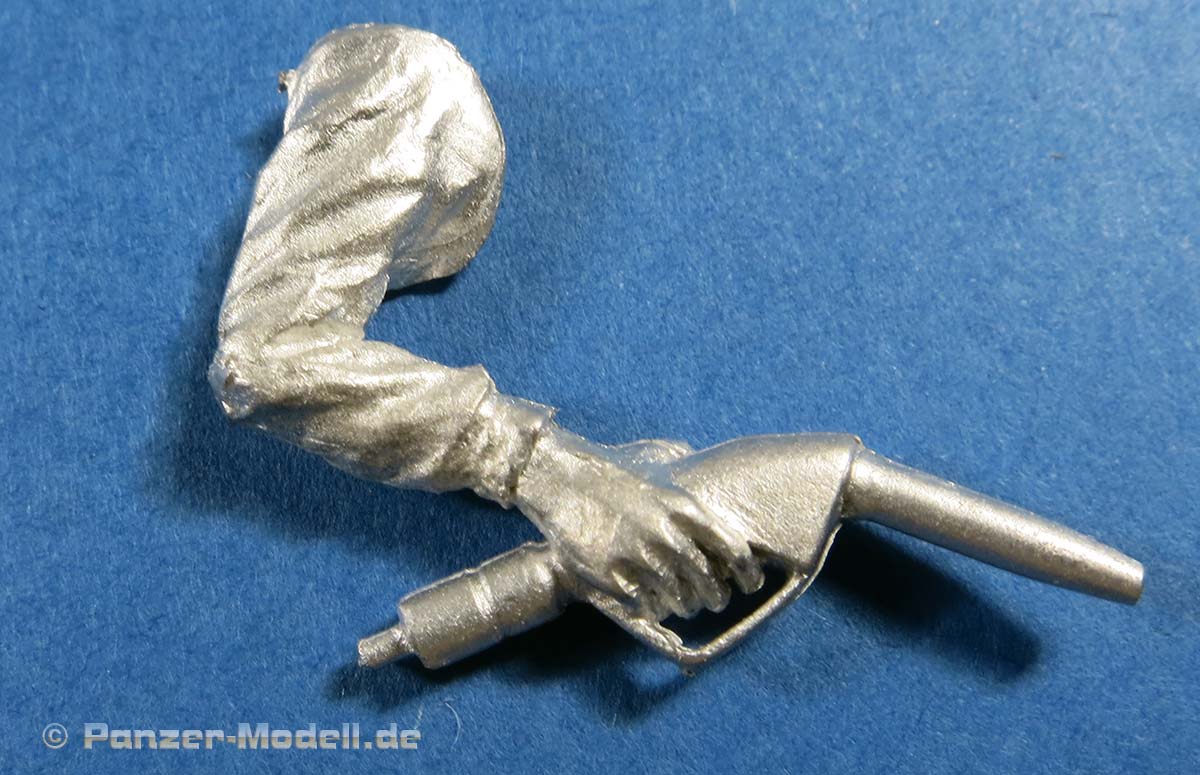 Wie bei Dolp gewohnt, finden wir im Bausatz Bauteile aus Metallguss, in diesem Fall zum Bau von einer Figur mit einem Tankstutzen in der Hand. Wie bei Metallguss üblich, sind die Oberflächen bei Nahbetrachtung etwas rauh, aber das sollte sich nach Bemalung und im normalen Betrachtungsabstand erübrigen.