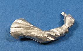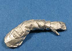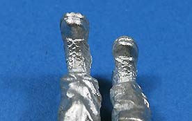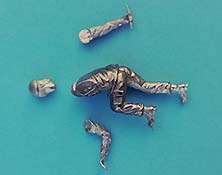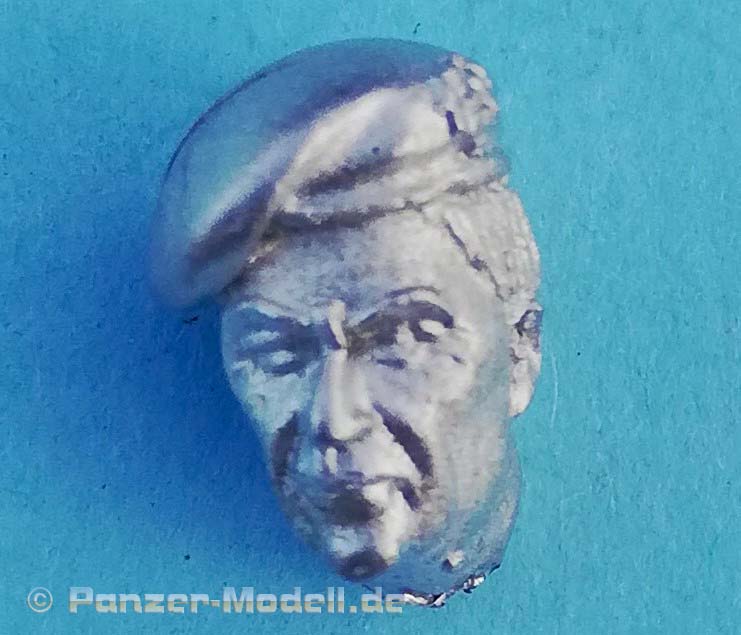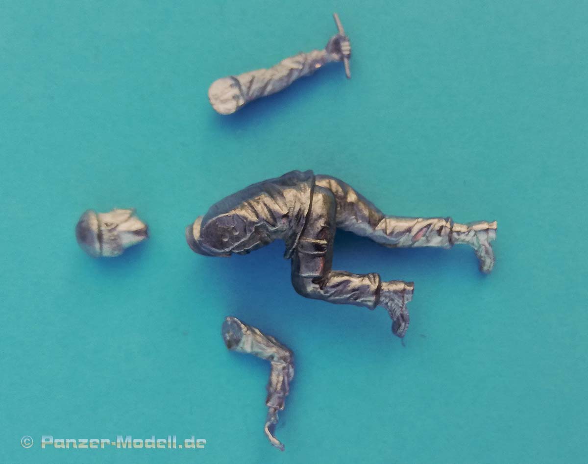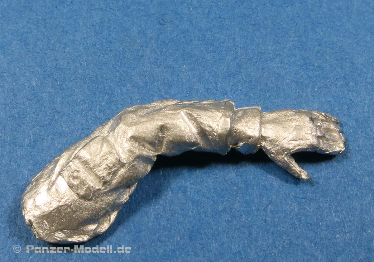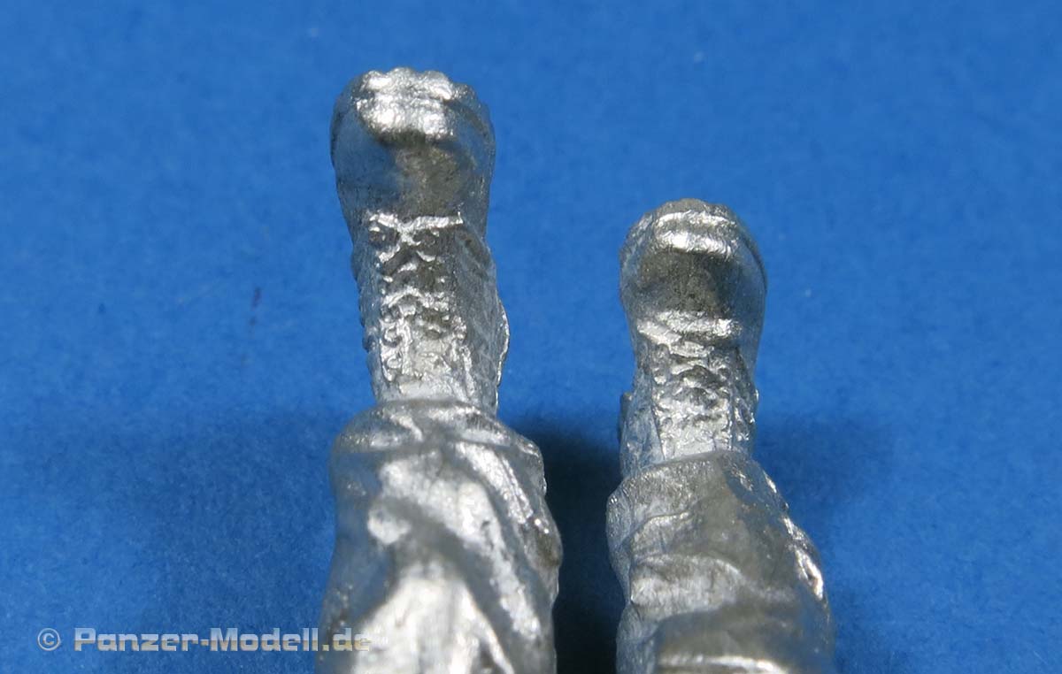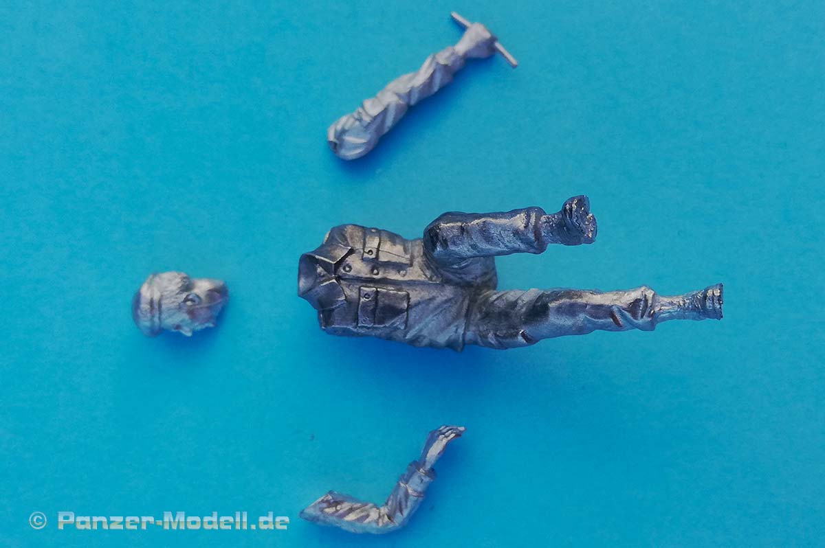 Das linke Bein fest am Boden ist Stütze für den leicht nach links gebeugten Oberkörper, der damit der öffnenden Tür ausweicht. Der rechte Fuß ist etwas angehoben und balanciert den Körper aus. Die rechte Hand hält dabei den - bereits angegossenen - Griff fest umschlossen. Somit ist die Figur primär für höher liegende Türen geeignet. Der Faltenwurf an Jacke und Ärmel gibt sehr schön die korrekte Position des rechten Arms vor. Der linke Arm hängt locker am Körper liegend herunter. Die gesamte Ausführung der Details, wie Knopfleiste, Barett, aufgesetzte Taschen bis hin zum Gesicht haben eine feine Ausprägung und sind somit eine gute Basis für die spätere Bemalung.