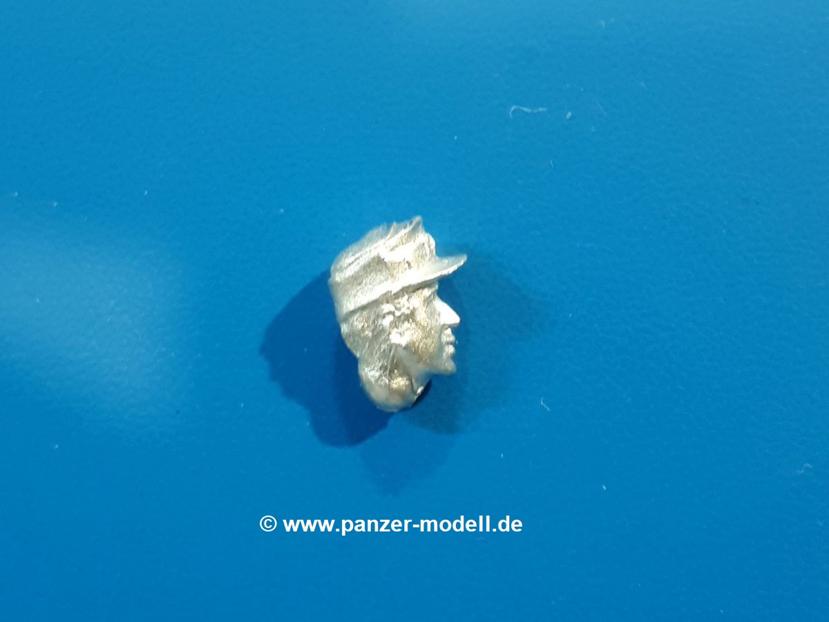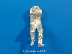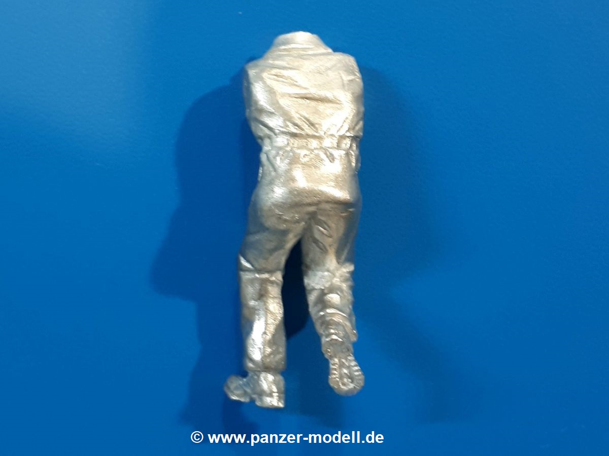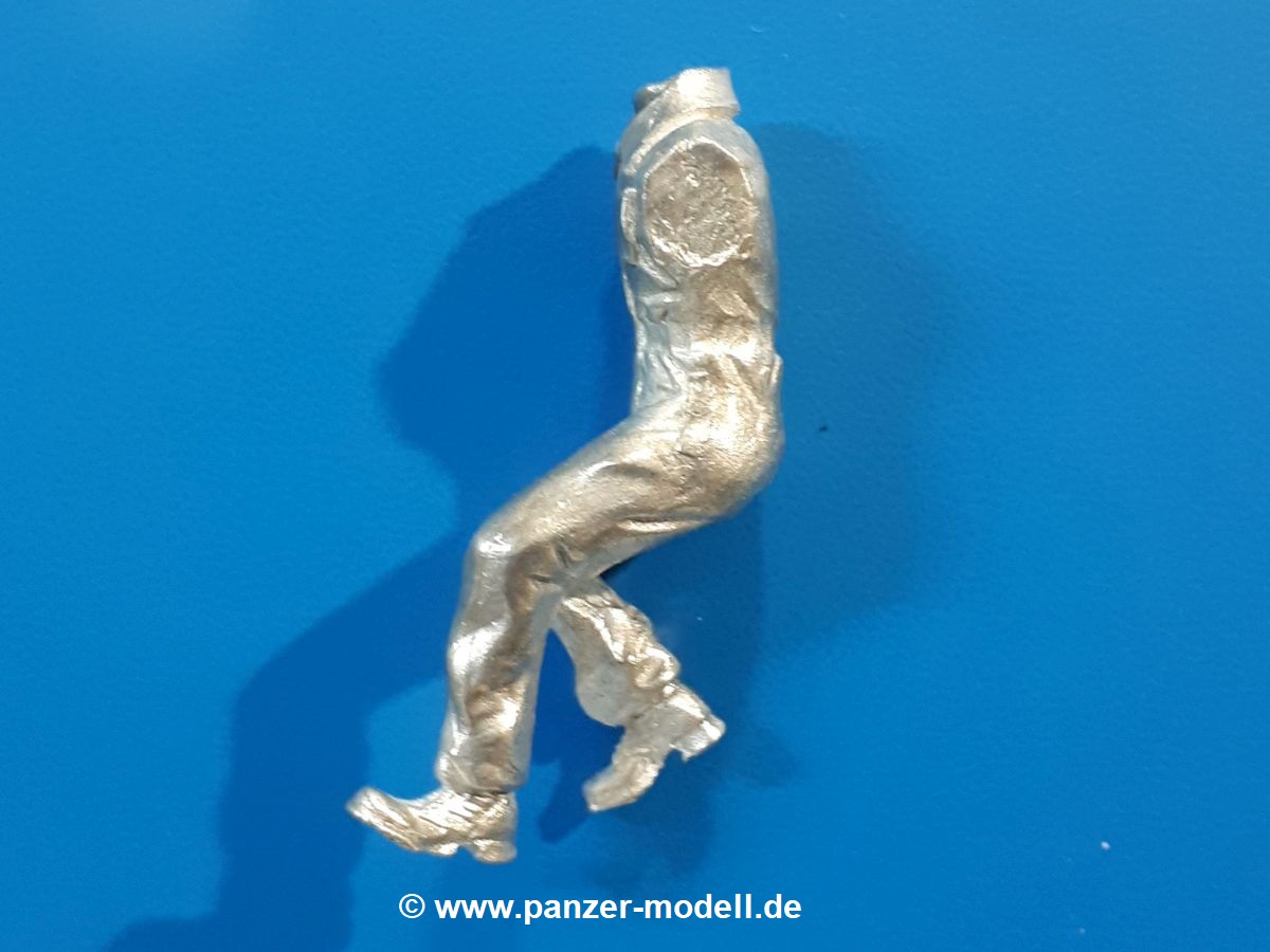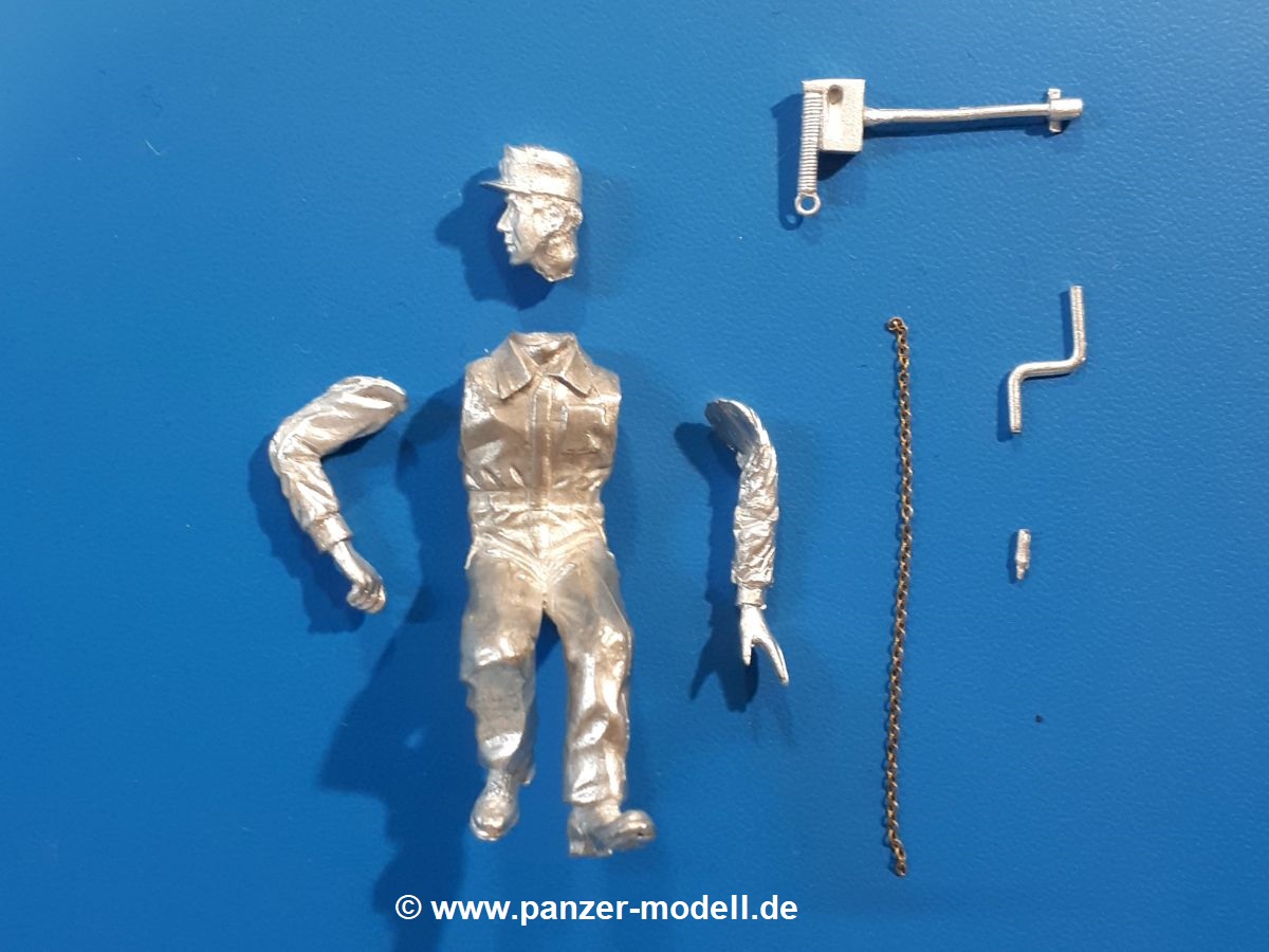 Um die neueren MAN KAT 1 Modelle von Hobby Boss etwas zu beleben, liefert uns Dolp ein ganze Reihe Bundeswehr Soldaten. Einen davon haben wir vor uns. Die Figur besteht aus dem Körper, Kopf und separaten Armen und kniet mit dem rechten Bein auf dem Sitz in der offenen Beifahrertür, stützt sich mit der linken Hand am Rahmen ab, während er mit der rechten die Handkurbel der Reserveradwinde bedient. Er trägt Kampfstiefel an den Füßen, eine Schirmmütze auf dem Kopf und den, für den technischen Dienst typischen, „Blaumann“ (Overall in blau). Der Blaumann kann ob seiner Natur nicht mit vielen Details glänzen. Er besitzt nur eine linke Brusttasche. Vorn überdeckt eine Knopfleiste die Knöpfe. Das Hüftband ist etwas eingezogen, so dass sich der typische Faltenwurf zeigt. Die Oberfläche der Teile weist eine leicht raue Struktur auf, die Metallguss so eigen ist, aber nach Bemalung wird das nicht mehr auffallen. Der Faltenwurf und die Oberflächendetails sind recht schön, wenn auch stellenweise etwas weich. Details wie das Gesicht und die Stiefelsohlen sind gut gestaltet. Zu der Figur gehört eine Kettenwinde, eine Handkurbel, ein Stück feine Kette und ein Bolzen. Die Winde besteht aus dem Gehäuse, einer Spiralfeder und der Kurbelstange bis zum Fahrerhaus. Die Kette ist lang genug für ein halb heruntergelassenes Reserverad, welches im Hinblick auf eine weitere Figur von Dolp genau richtig ist. Die Bedeutung des Bolzens ist mir unbekannt. Ich kann nur vermuten, dass er seinen Platz an der Reserveradhalterung findet und das andere Ende der Kette aufnimmt. Hier hätte ich Unterstützung von Dolp in Form eines Anbringungshinweises erwartet. Die Figur und die Winde werden den BW MAN sicherlich beleben. Tolle Sache von Dolp. |