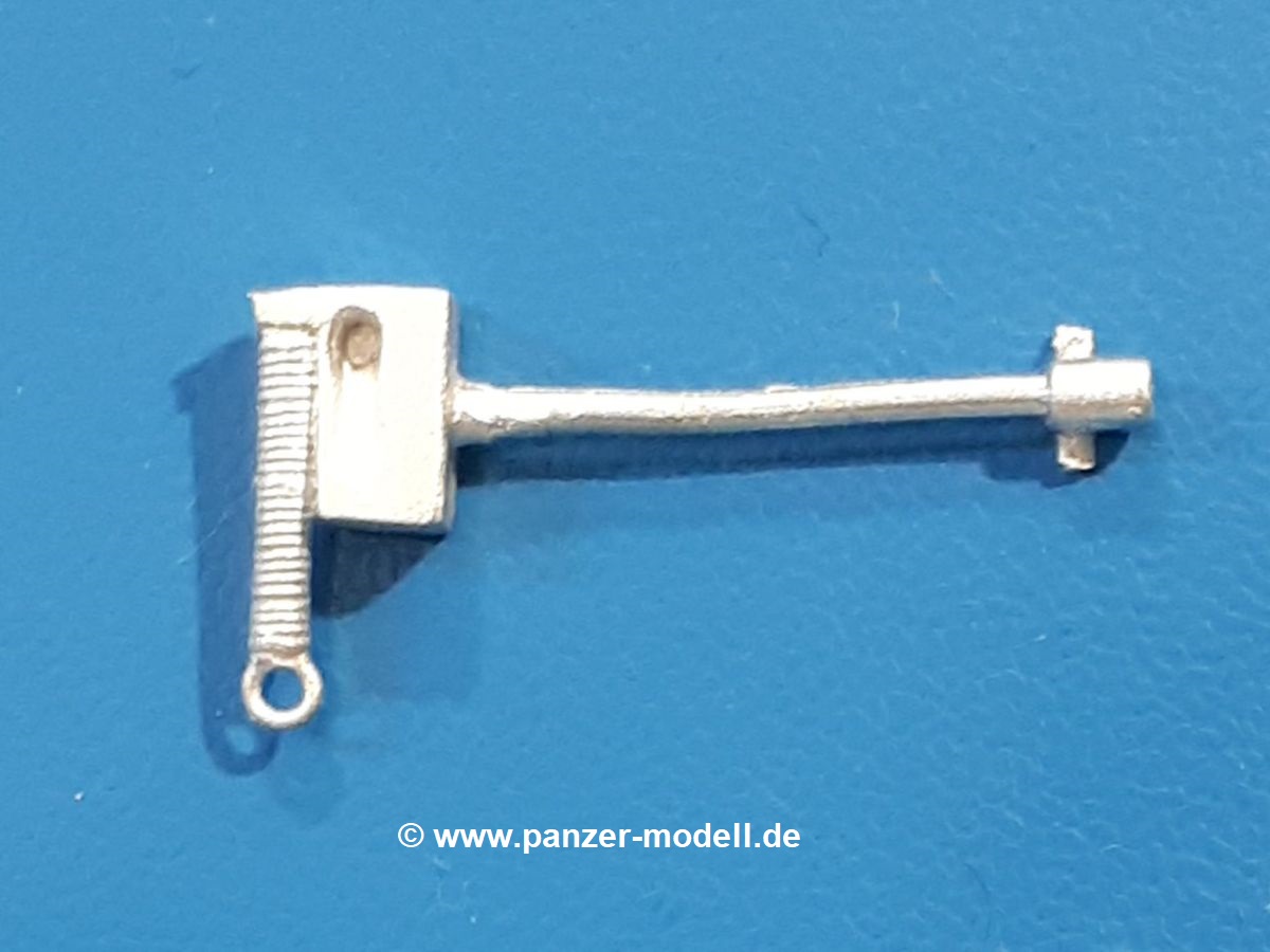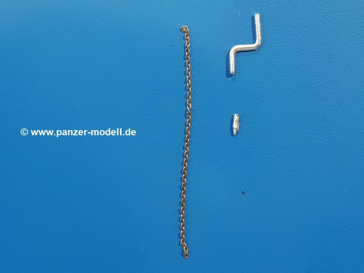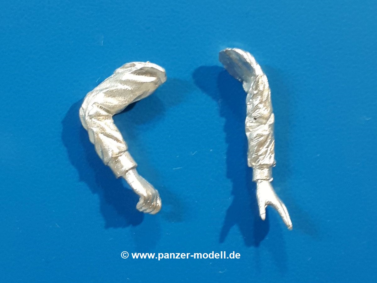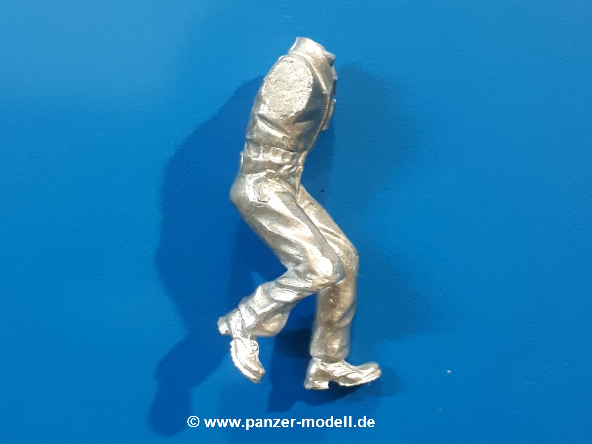 Um die neueren MAN KAT 1 Modelle von Hobby Boss etwas zu beleben, liefert uns Dolp ein ganze Reihe Bundeswehr Soldaten. Einen davon haben wir vor uns. Die Figur besteht aus dem Körper, Kopf und separaten Armen und kniet mit dem rechten Bein auf dem Sitz in der offenen Beifahrertür, stützt sich mit der linken Hand am Rahmen ab, während er mit der rechten die Handkurbel der Reserveradwinde bedient. Er trägt Kampfstiefel an den Füßen, eine Schirmmütze auf dem Kopf und den, für den technischen Dienst typischen, „Blaumann“ (Overall in blau). Der Blaumann kann ob seiner Natur nicht mit vielen Details glänzen. Er besitzt nur eine linke Brusttasche. Vorn überdeckt eine Knopfleiste die Knöpfe. Das Hüftband ist etwas eingezogen, so dass sich der typische Faltenwurf zeigt. Die Oberfläche der Teile weist eine leicht raue Struktur auf, die Metallguss so eigen ist, aber nach Bemalung wird das nicht mehr auffallen. Der Faltenwurf und die Oberflächendetails sind recht schön, wenn auch stellenweise etwas weich. Details wie das Gesicht und die Stiefelsohlen sind gut gestaltet. Zu der Figur gehört eine Kettenwinde, eine Handkurbel, ein Stück feine Kette und ein Bolzen. Die Winde besteht aus dem Gehäuse, einer Spiralfeder und der Kurbelstange bis zum Fahrerhaus. Die Kette ist lang genug für ein halb heruntergelassenes Reserverad, welches im Hinblick auf eine weitere Figur von Dolp genau richtig ist. Die Bedeutung des Bolzens ist mir unbekannt. Ich kann nur vermuten, dass er seinen Platz an der Reserveradhalterung findet und das andere Ende der Kette aufnimmt. Hier hätte ich Unterstützung von Dolp in Form eines Anbringungshinweises erwartet. Die Figur und die Winde werden den BW MAN sicherlich beleben. Tolle Sache von Dolp. |