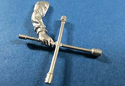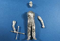 Wie gewohnt, finden wir im Bausatz Bauteile aus Metallguss, in diesem Fall zum Bau einer Figur mit einem Radkreuz in der Hand. Wie bei Metallguss üblich, sind die Oberflächen bei Nahbetrachtung etwas rauh, aber das sollte sich nach Bemalung und im normalen Betrachtungsabstand erübrigen.