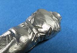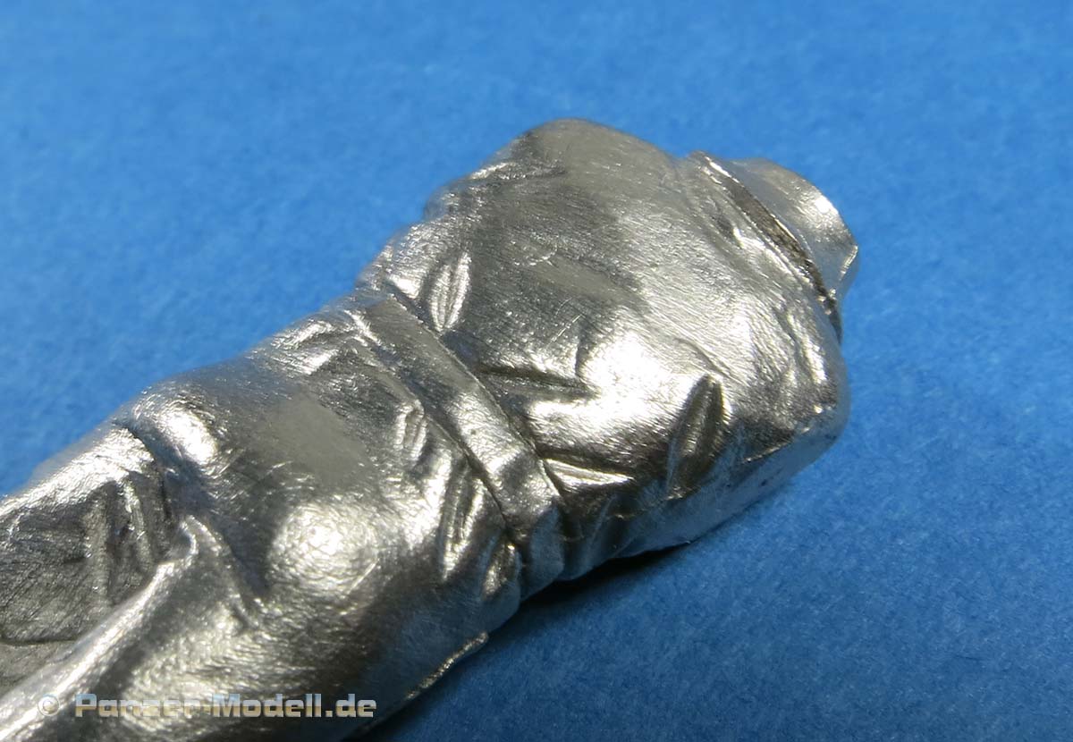 Arme und Hände sind gut und recht fein gestaltet mit entsprechendem Faltenwurf an den Ärmeln und schön gestalteten Handposen. Die rechte Hand hat, wie bereits erwähnt, bereits das Radkreuz mit angegossen - auf diese Weise liegt dieses perfekt in der Hand.