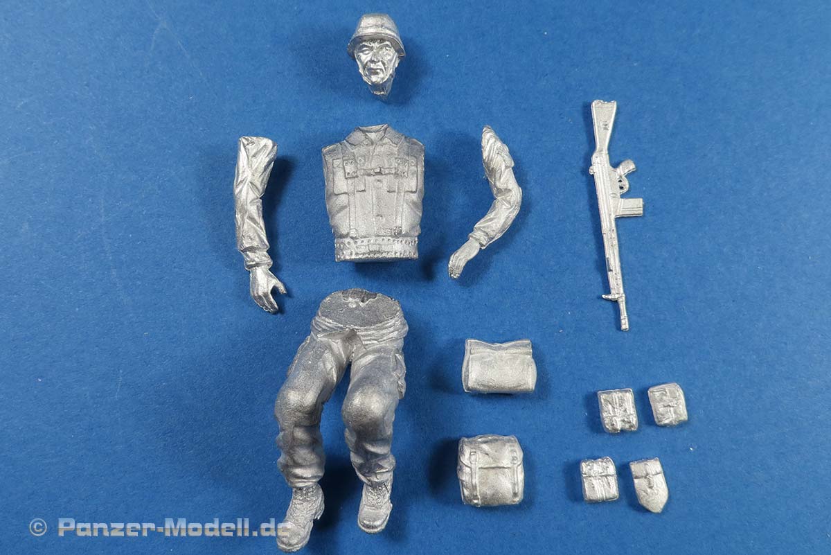 In der Packung finden wir insgesamt 12 Metallteile zum Bau einer Figur, deren Körper sich aus Ober- und Unterteil plus zwei Armen und dem Kopf zusammensetzt. Dazu gibt es die typischen Anhängsel wie ABC Schutztasche, kleine Kampftasche, Magazintaschen, Klappspaten, usw. und natürlich das obligatorische G3.