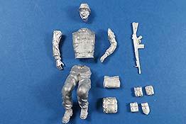 Wie gewohnt, finden wir im Bausatz Bauteile aus Metallguss, in diesem Fall zum Bau einer Figur locker sitzend, wie man es kennt wenn man Platz auf der Ladefläche hat.
