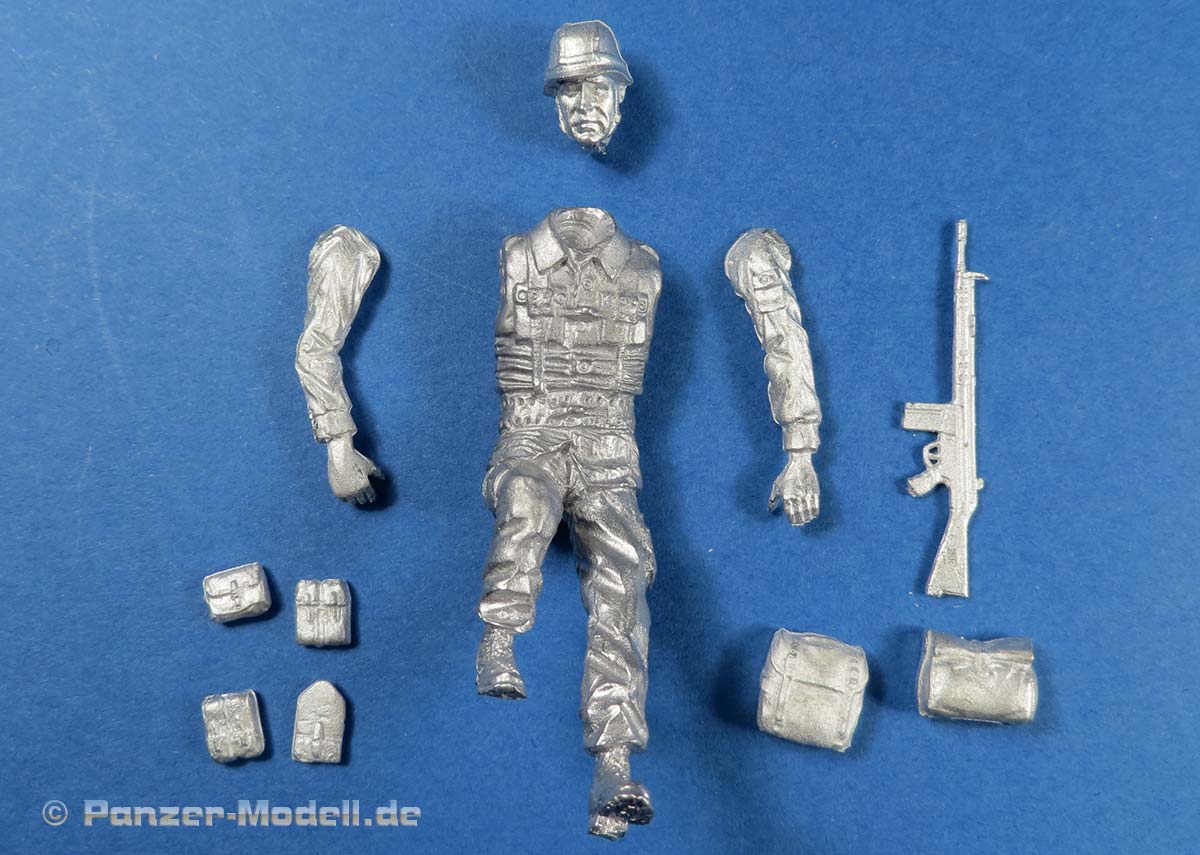 In der Packung finden wir insgesamt 11 Metallteile zum Bau einer Figur, deren Körper in eienm Stück gegissen ist und mit zwei Armen und dem Kopf vervollständigt wird. Dazu gibt es die typischen Anhängsel wie ABC Schutztasche, kleine Kampftasche, Magazintaschen, Klappspaten, usw. und natürlich das obligatorische G3.