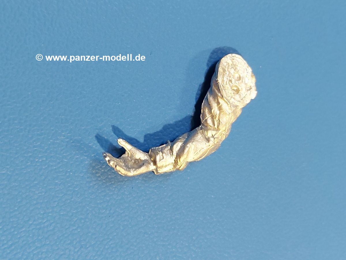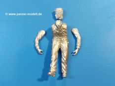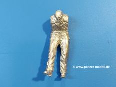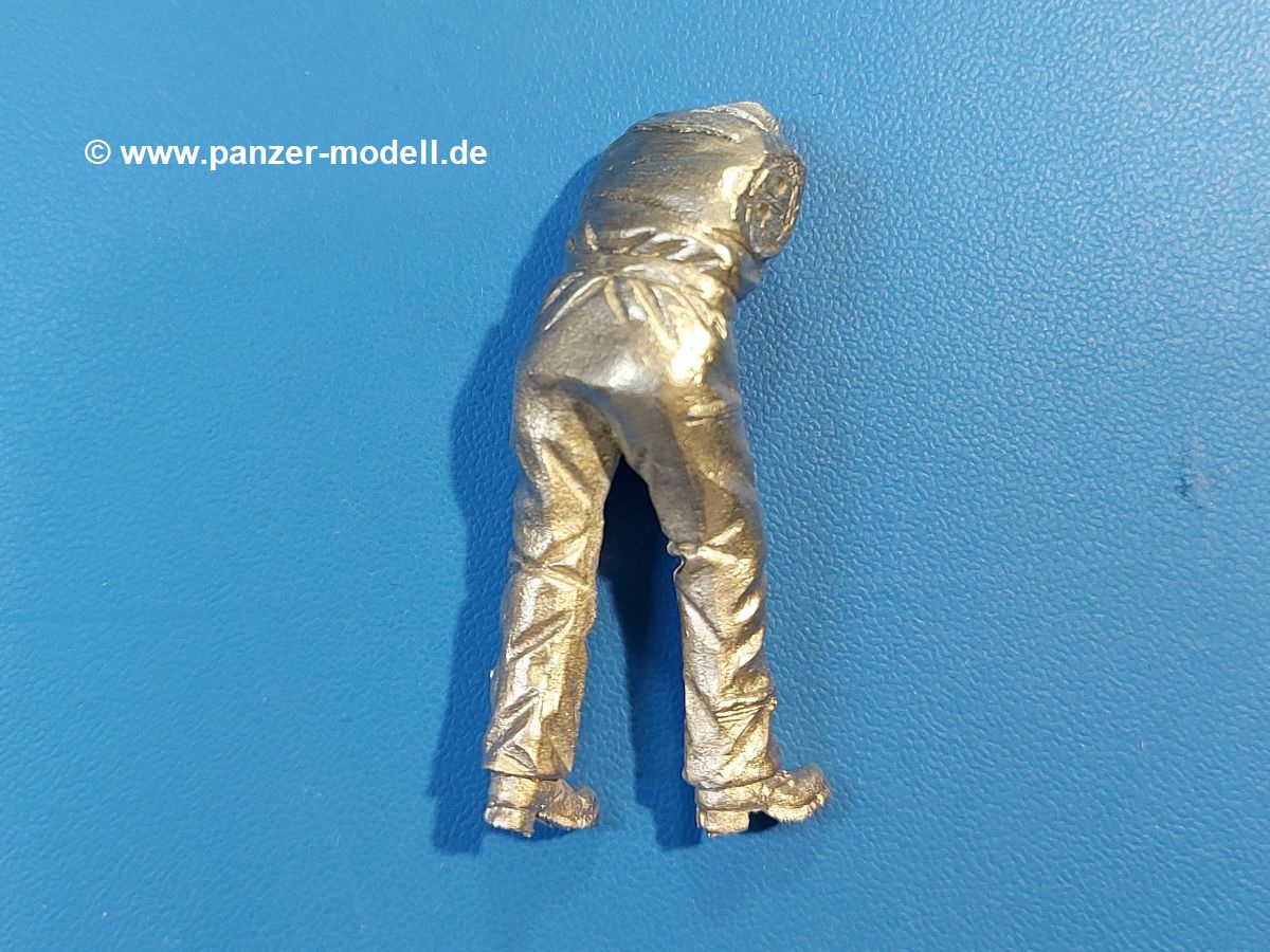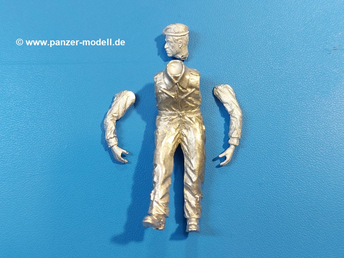 Dolp liefert uns weitere Bundeswehr Soldaten passend zum Leopard 1, hier im speziellen zum Fahrschulpanzer Leopard 1. Die Sätze BW-181 und BW-182 beinhalten Soldaten beim Aufstieg von der Seite auf den Fahrschulpanzer. Dieser hier befindet sich bereits auf dem Heck und ist dabei, das Einstiegsfenster der Fahrschulkabine zu öffnen. Die Figur besteht aus dem Körper, Kopf und separaten Armen und steht leicht vorgebeugt und mit leicht nach oben gebeugten Unterarmen, den unteren Rand des Einstiegsfensters fassend. Er trägt Kampfstiefel an den Füßen, ein Barrett mit angedeutetem Panzerabzeichen auf dem Kopf und die damals übliche Panzerkombi, die an den Beinen über die Kampfstiefel fällt. Die Reißverschlüsse der Brusttaschen sind deutlich zu sehen inkl. der Zugösen. Statt dem eingezogenen Hüftband der Kombi, trägt der Kamerad ein Koppel. Nicht unbedingt notwendig, aber so oft gesehen. Die Oberfläche der Teile weist eine leicht raue Struktur auf, die Metallguss so eigen ist. Dies fällt diesmal grad beim Gesicht auf. Der Faltenwurf und die Oberflächendetails sind recht schön, wenn auch stellenweise etwas weich. Details wie das Gesicht und die Hände sind ansprechend geformt. Auch diese Figur kann man ggfs. auch anders einsetzen wie z. B. beim Anheben von etwas. |