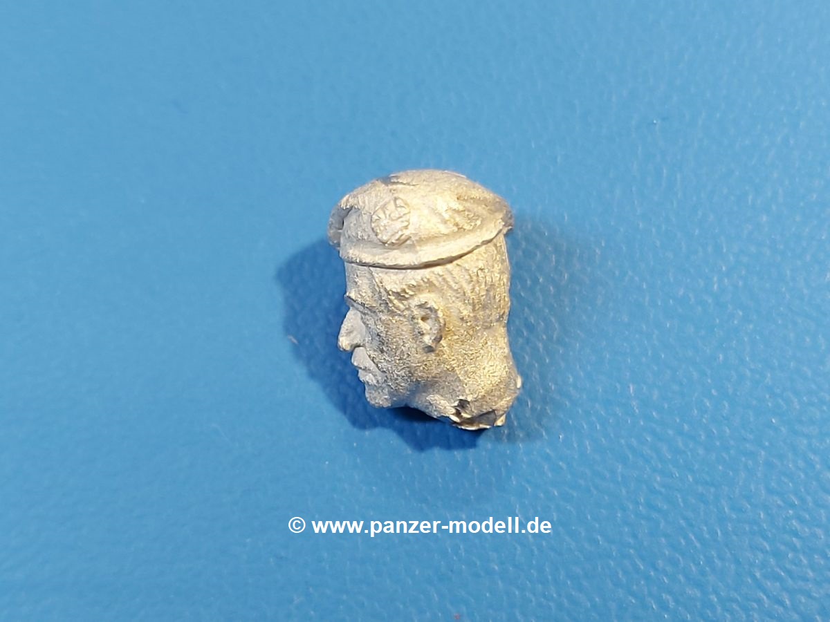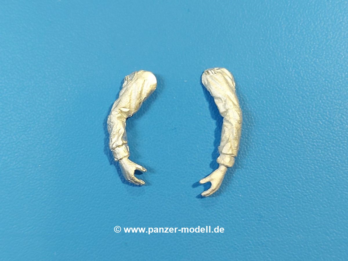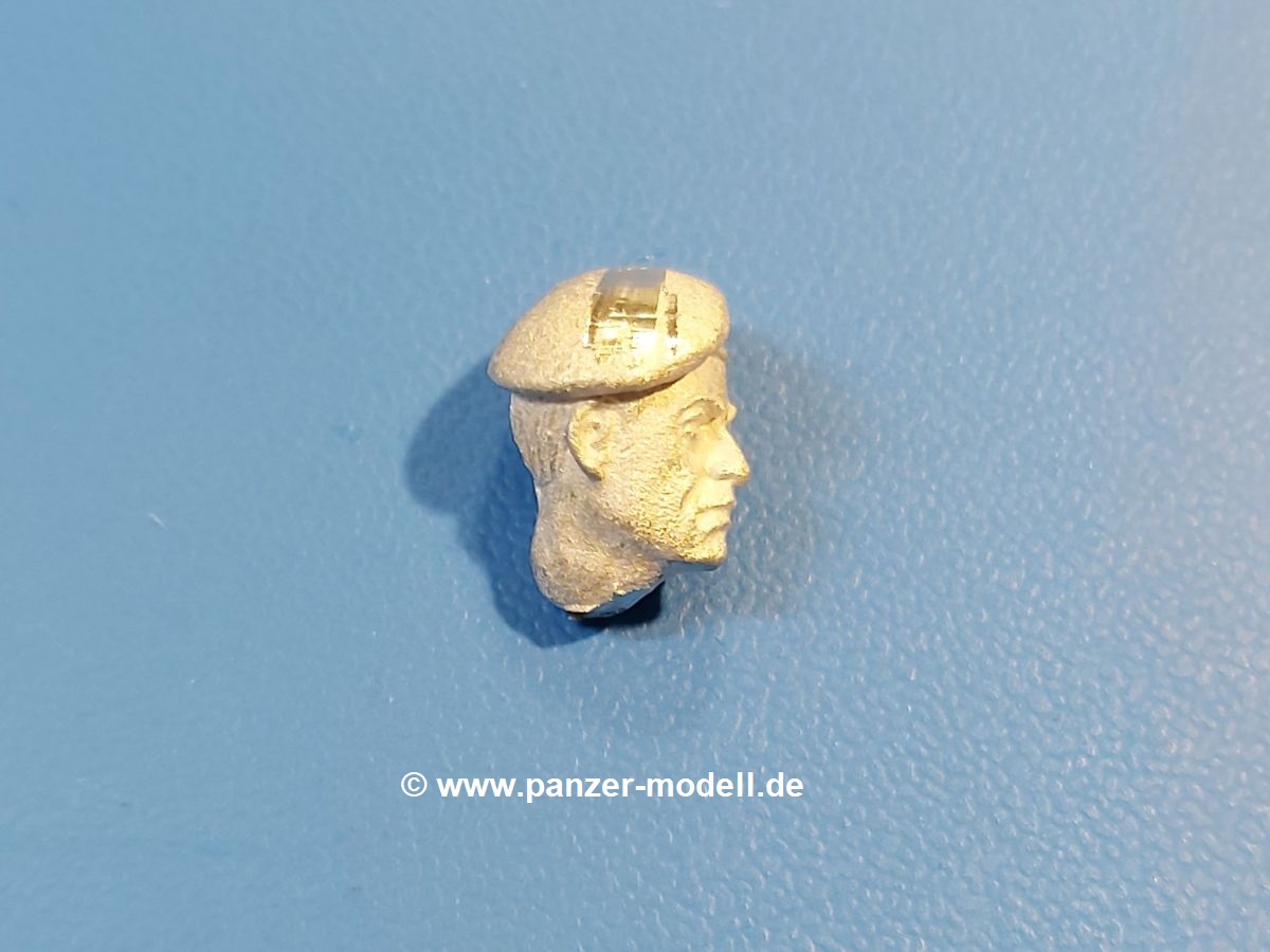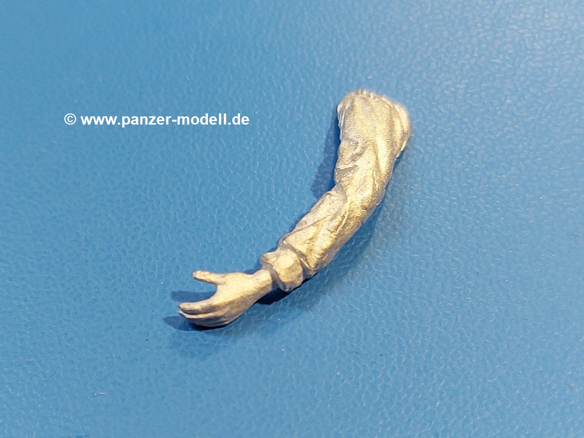 Dolp liefert uns weitere Bundeswehr Soldaten passend zum Leopard 1, hier im speziellen zum Fahrschulpanzer Leopard 1. Die Sätze BW-181 und BW-182 beinhalten Soldaten beim Aufstieg von der Seite auf den Fahrschulpanzer. Dieser hier befindet sich bereits auf dem Heck und ist dabei, das Einstiegsfenster der Fahrschulkabine zu öffnen. Die Figur besteht aus dem Körper, Kopf und separaten Armen und steht leicht vorgebeugt und mit leicht nach oben gebeugten Unterarmen, den unteren Rand des Einstiegsfensters fassend. Er trägt Kampfstiefel an den Füßen, ein Barrett mit angedeutetem Panzerabzeichen auf dem Kopf und die damals übliche Panzerkombi, die an den Beinen über die Kampfstiefel fällt. Die Reißverschlüsse der Brusttaschen sind deutlich zu sehen inkl. der Zugösen. Statt dem eingezogenen Hüftband der Kombi, trägt der Kamerad ein Koppel. Nicht unbedingt notwendig, aber so oft gesehen. Die Oberfläche der Teile weist eine leicht raue Struktur auf, die Metallguss so eigen ist. Dies fällt diesmal grad beim Gesicht auf. Der Faltenwurf und die Oberflächendetails sind recht schön, wenn auch stellenweise etwas weich. Details wie das Gesicht und die Hände sind ansprechend geformt. Auch diese Figur kann man ggfs. auch anders einsetzen wie z. B. beim Anheben von etwas. |
