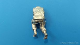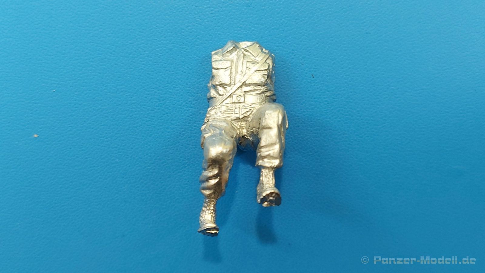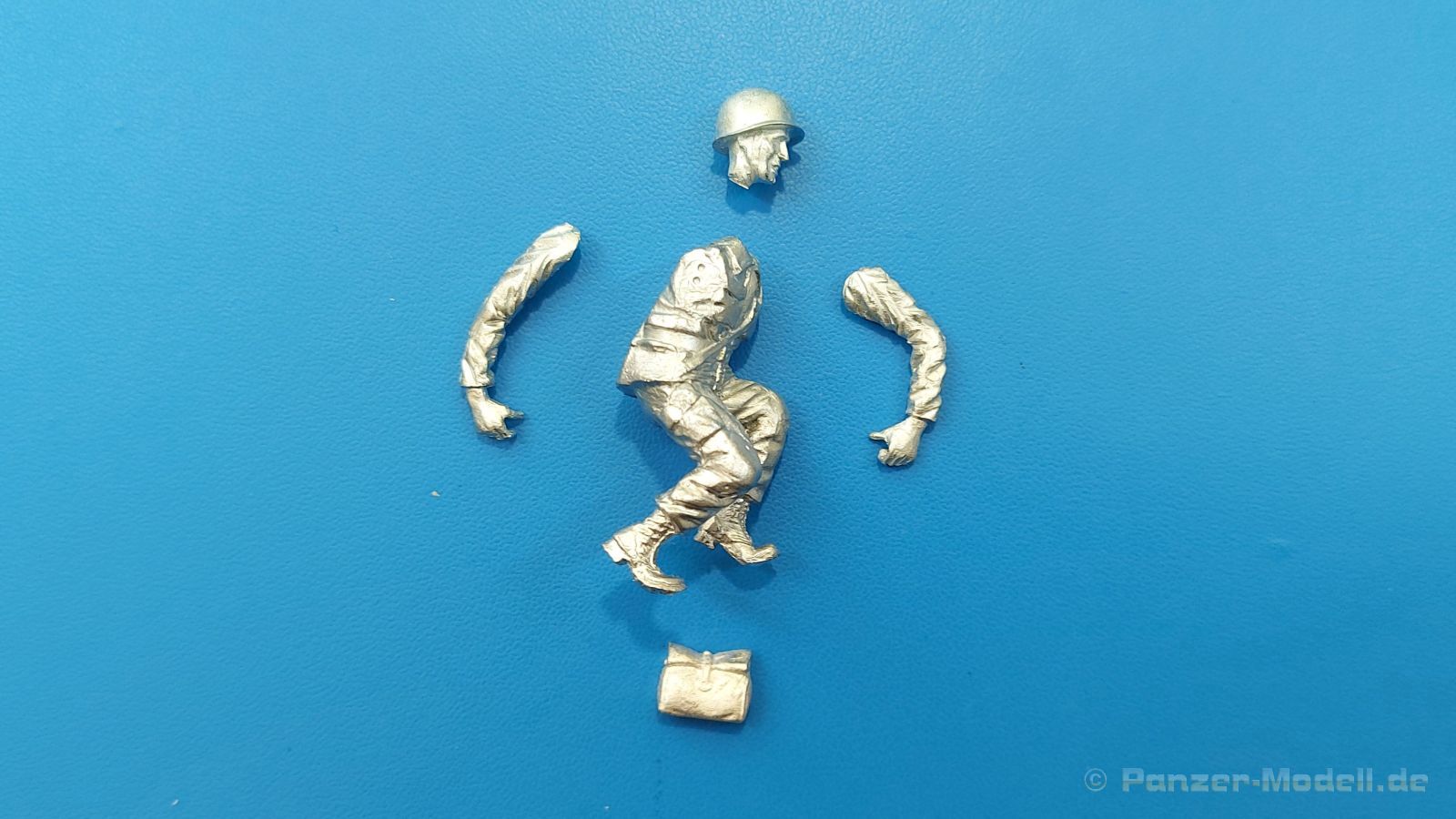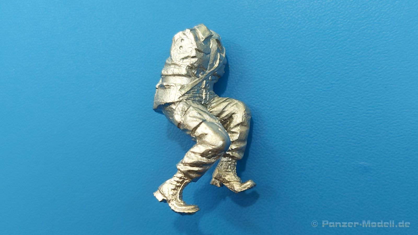 Bei dieser Figur haben wir den Richtschützen vor uns, der vornübergebeugt mit angewinkelten Beinen die Abstützplatte des Werfers (Teile D6, D10 und D26 aus dem Hobby Boss Bausatz) in den Stützstempel einhängt. DOLP gibt die Funktion des Soldaten im Titel vor, aber da sich die Uniformen nicht unterschieden, entscheidet Ihr das selbst mittels entsprechender Bemalung der Schulterklappen. (In unseren AUSGEPACKT werdet Ihr auch die anderen Besatzungsmitglieder finden.) Die Figur besteht aus dem Körper, also Oberkörper inkl. Beinen, dem Kopf, den Armen und einer ABC-Tasche. Der Soldat trägt einen Kampfanzug M60, bestehend aus Hosen mit seitlichen Oberschenkeltaschen und einer Jacke mit zwei großen Brusttaschen. Er trägt ein Koppel über der Jacke. Der Tragegurt der ABC-Tasche ist angegossen und geht von der rechten Schulter zur linken Hüfte. Er scheint über das Koppel zu gehen, was wir Soldaten gern vermieden haben, weil sonst die Tasche beim Laufen immer hin- und hergeschlagen ist. Als Alternative einfach die Teile auf dem Koppel wegschleifen, dann ist man der Praxis näher. An den Füßen trägt die zu dieser Zeit geläufigen Kampfstiefel. Die Schnürung der Stiefel ist gut gelungen und die Stiefelsohlen weisen ein Profil auf. Die Figur wird auf dem Ballen stehen, die Fersen angehoben. Beide Arme sind so gestaltet, dass der Soldat die Abstützplatte mit beiden Händen halten kann. Die Bekleidung zeigt einen glaubhaften Faltenwurf. Auf dem Kopf ist der Stahlhelm gleich angegossen. Die Struktur und Form des Helmes gefallen mir. Noch schöner wäre es gewesen, wenn der innere Rand ausgehöhlt wäre. Vermutlich ließ sich das gusstechnisch nicht anders lösen. Der Kinnriemen ist deutlich zu sehen und geschlossen. Die Gesichtszüge sind deutlich und ansprechend gestaltet. Die ABC-Tasche zeigt den eingeschlagenen Rand mit der Schnellöffnerlasche. Die Unterseite hätte aber etwas keilförmiger sein können. Insgesamt weist die Oberfläche eine leicht raue Struktur auf, die Metallguss so eigen ist, aber nach entsprechender Bemalung wird das nicht mehr auffallen. Der Faltenwurf und die Oberflächendetails sind recht schön. Hier und da findet sich feiner Gussgrat, der sich leicht entfernen lässt. Die Figur ist für ca. 9 EUR auf dem deutschen Markt erhältlich. |