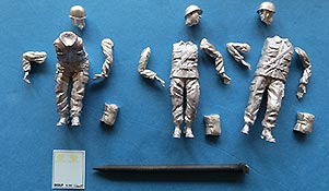 Für den LKW 7t mil gl LARS 2 bietet Dolp nun einen Bausatz einer dreiköpfigen Besatzung, die den Werfer vom Boden aus mit einer Rakete belädt. Der Faltenwurf und die Oberflächendetails der Figuren wissen wie gewohnt zu gefallen und sind recht ordentlich ausgearbeitet, wennauch metallgusstypisch stellenweise etwas soft in der Detaillierung. Auch wirkt der Metallguss bei extremer Nahbetrachtung recht rauh - aber das sollte sich mit der Bemalung und normalem Betrachtungsabstand wieder geben. Die Köpfe sind wie gewohnt schön dargestellt mit passenden und realistischen Gesichtszügen soweit in Metallguss eben möglich. Als Kopfbedeckung wird der typische Stahlhelm getragen. Das Set kostet rund 30 Euro und bietet schöne Figuren und Zubehör um einer Ladeszene ein wenig Leben einzuhauchen. |