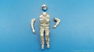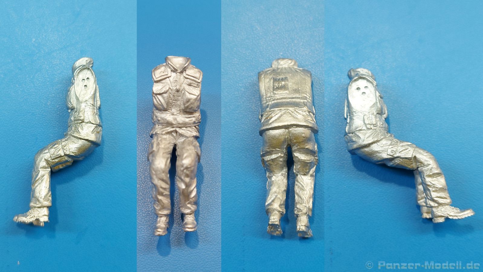 DOLP hat eine ganze Serie von Bundeswehrsoldaten passend für den TPz. 1 Fuchs von Revell herausgebracht. Da die Figuren moderne Ausrüstung in Form von Bristol Schutzwesten und -helmen tragen, empfiehlt der Hersteller, den Revell Fuchs mit entsprechenden Sets von MAD-Modellbau auf den entsprechenden Stand zu bringen. Bei seinen Figuren gibt DOLP gibt die Funktion des Soldaten im Titel vor. Dieses Mal betrachten wir die Figur des Beifahrers, der auch das MG bedient. (In unseren AUSGEPACKT werdet Ihr auch die anderen Besatzungsmitglieder finden.) Der MG-Schütze sitzt auf dem Lukenrand, mit dem linken Arm auf der Luke abgestützt, die rechte Hand am MG. Die Figur besteht aus 5 Teilen. Rumpf und Beine bilden eine Einheit. Wie bereits erwähnt trägt er eine Bristol Schutzweste mit hochstehendem Kragen, ausgebeulten Brusttaschen und einer kleinen Rückentasche. Die Hosenbeine gehen bis über die Schnürstiefel. Die Seitentaschen sind wie die Brusttaschen der Weste ausgebeult. Am linken Oberarm befindet sich eine kleine Ärmeltasche. Der Kopf ist mit Helm bereits in einem Stück gegossen. Schön zu sehen sind die Riemen des Helmes. Auch das Gesicht gefällt mir. Auf dem Helm ist die Staubschutzbrille angegossen. Auf den Fotos habe ich das fünfte Teil nicht eingefangen. Es ist der Bügel mit dem Lippenmikrofon. Aufpassen beim Öffnen des Tütchens, denn das Teil ist ziemlich klein. Insgesamt weist die Oberfläche eine leicht raue Struktur auf, die Metallguss so eigen ist, aber nach entsprechender Bemalung wird das nicht mehr auffallen. Der Faltenwurf und die Oberflächendetails sind recht schön. Hier und da findet sich feiner Gussgrat, der sich leicht entfernen lässt. Die Figur ist für ca. 9 EUR auf dem deutschen Markt erhältlich. |