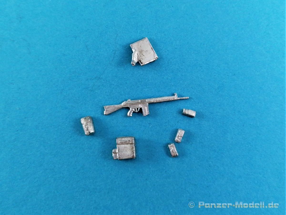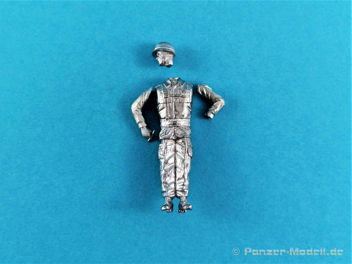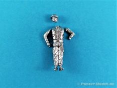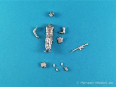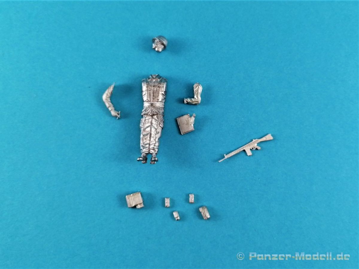 Die Funktion der Figur bzw. des Soldaten gibt Dolp bereits im Titel vor. In dem Blisterpack finden sich insgesamt neun Metallteile aus Zinn die zum Bau der Figur benötigt werden. Einmal der Körper, zwei Arme, ein Kopf mit Helm, ein Klemmbrett mit angegossener linker Hand, drei weitere Ausrüstungsteile und ein G3. Der Faltenwurf und die Oberflächendetails sind recht ordentlich ausgeführt. Alles etwas soft in der Detaillierung aber das ist dem Material geschuldet. Auch mit der Grund einer teilweise rauhen Oberflächenstruktur. Gußgrat findet sich nur an ganz wenigen Stellen und dürfte relativ schnell beseitigt werden. Oberkörper und Beine kommen in einem Stück daher. Die Arme sind gesondert. In der rechten Hand hält der Soldat einen Stift während die linke Hand an das Klemmbrett angegossen ist. Auch der Kopf ist (mit angegossenem Helm), recht ansprechend dargestellt. Zu verbauen sind abschließend noch die Ausrüstungsteile und das gefällige G3. Die Pose, stehend, dürfte diese Figur für recht mannigfaltige Szenen und Kombinationen einsetzbar machen. Das A und O sollte bei dieser Figur aber die Bemalung sein. Wer BW baut kommt an diesem Kit eigentlich nicht vorbei. Bei rund EUR 9,00 die für den Kit fällig werden kann man auch nicht meckern. |