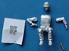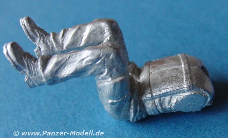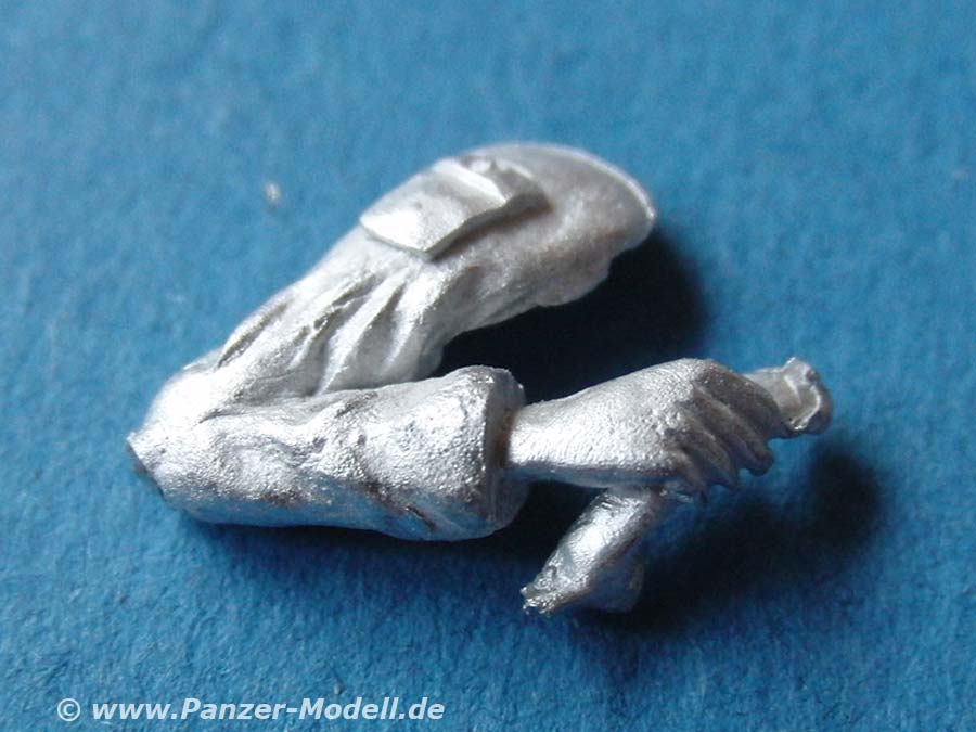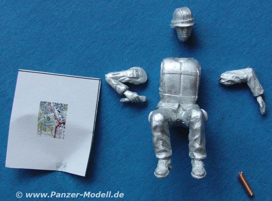 Die Position ist sitzend mit angewinkelten beinen, sodass sich die Figur auf den Beifahrer Sitz der M3 Amphibie platzieren lässt. Der rechte Arm ist so angewinkelt dass der mit eingegossene Hörer an das Ohr geführt werden kann. Für das Hörerkabel ligt dünner, bereits spiralisierter Draht mit bei. Zur weiteren Ergänzung liegt ebenfalls eine kleine 1:35 Gekändekarte bei.