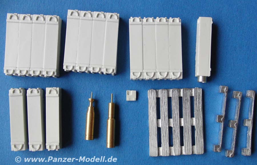 Dieses beeindruckende Set enthält eine Europlaette aus Metallteilen, drei Viererblocks an Granatenkisten, drei geschlossenen Einzelkisten und einer geöffneten Einzelkiste mit herausgezogenem Inlay aus Resin, sowie 2 Metallgranaten, die je eine KE und eine MZ-Granate darstellen.