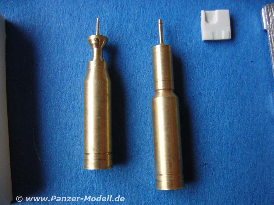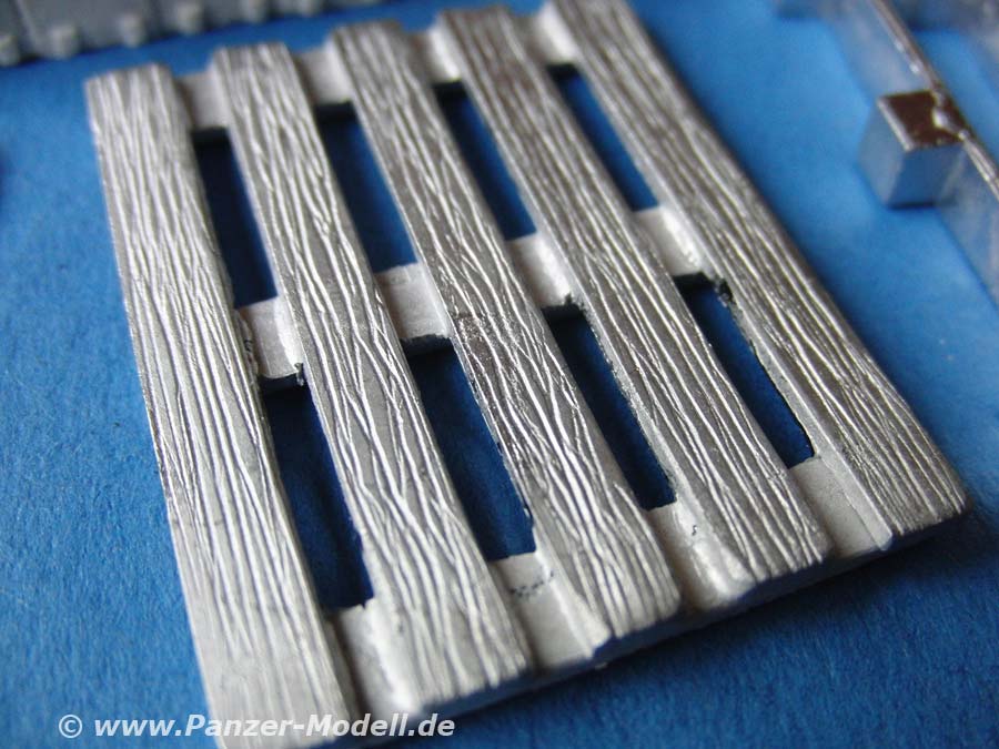 Der Gesamteindruck ist sehr gut, die Palette aus Weissmetall weist eine schöne Holzstruktur auf und die Munitionskistenstapel aus Resin können sich ebenfalls sehen lassen - keine Luftblasen oder Verzug ... alles sauber und detailliert. Als gut empfinde ich auch die Möglichkeit die Stapelhöhe selber zu gestalten bzw. die oberste reihe durch die einzelnen Mun Boxen individuell anzupassen. Herausragend ist hier natürlich die offene kiste mit inlay und die beigabe von zwei sehr schön gedrehten und detaillierten Granaten (KE oder MZ) aus Metall von Schatton Modellbau.