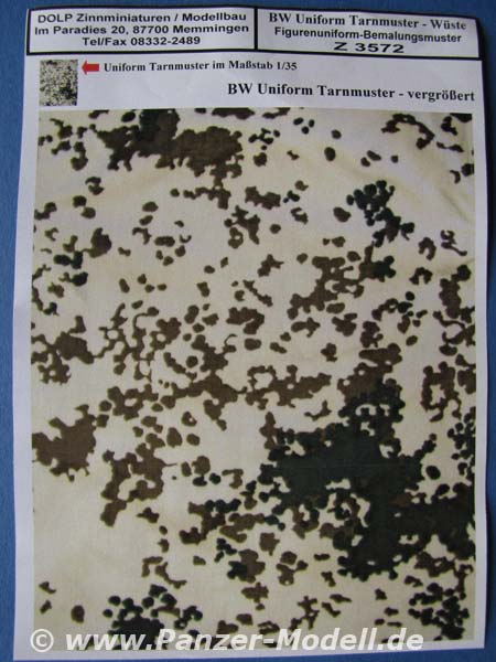 Wie bereits beim Set 3571 handelt sich bei diesem um einen A5 Bogen, auf dem farbgetreu Bundeswehr Flecktarnmuster gezeigt ist, diesmal allerdings das Wüstentarnschema.