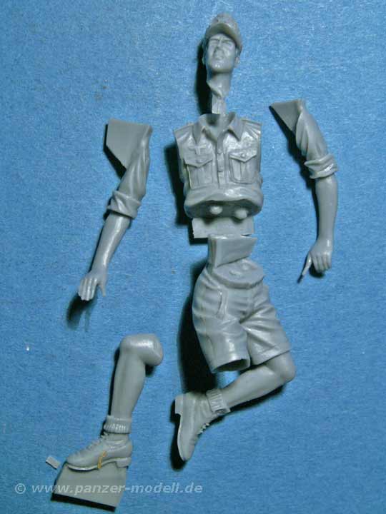 Die Gussqualität und Darstellung der Details ist wirklich allererste Klasse. Die Figur besteht aus dem Rumpf mit einem angegossenen Bein und einem einzelnen Bein, sowie den einzelnen Armen und dem Kopf. Die Angüsse sind human und dürften schnell zu entfernen sein.