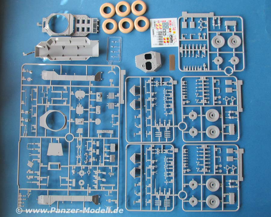 Schauen wir also mal in den Karton ... dieser ist relativ mager befüllt. Es finden sich 6 Spritzlinge, ein Spritzling mit Klarsichtteilen, Unter- und Oberwanne, Turm, 6 DS-Reifen, ein PE Teil und ein Decalbogen.