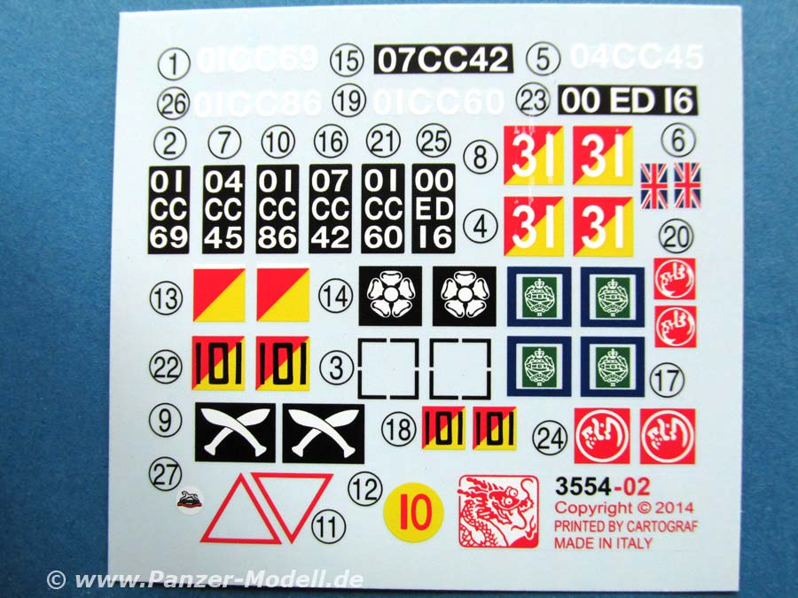 Zur Bemalung gibt es sechs Bemalungs/Markierungsvorschläge in den typischen Dragonzeichnungen, die sich mit dem sauber und bunt gedruckten Decalbogen realisieren lassen.