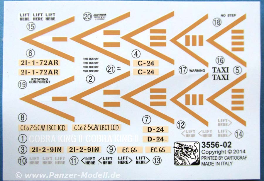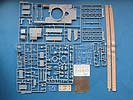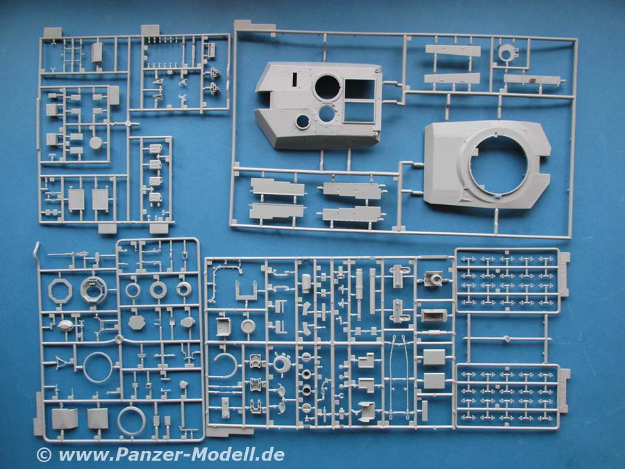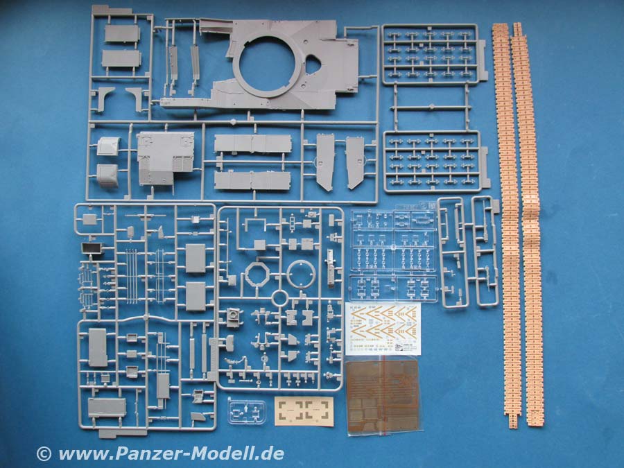 Im Bausatz finden wir 15 Spritzlinge, zwei spritzlinge Klarsichtteile, zwei DS Ketten, eine PE Platine und ein Decalbogen.
