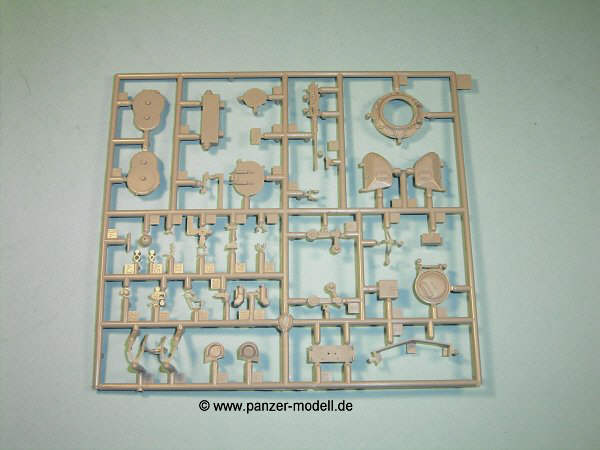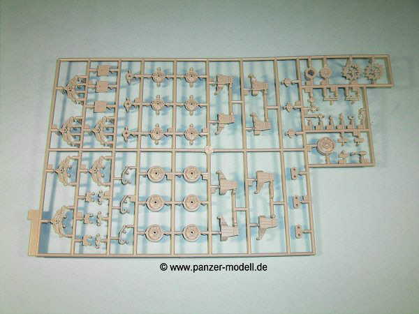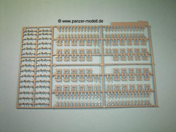 Als Kette liegt Dragontypisch eine Spritzgusseinzelkette bei. Es handelt sich um die aus den alten Firefly Modellen bekannte Steel Chevron Kette mit seperaten Endverbindern. Neu ist allerdings, daß Dragon diesem Modell zusätzlich die sogenannten "Duckbill Extender" beigelegt hat, man kann also auch die verbreiterten Ketten für weiche Untergründe bauen!
