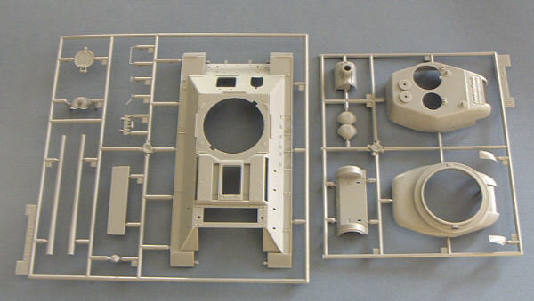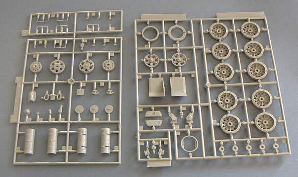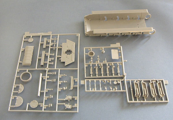 Das Modell selbst verteilt sich auf nicht weniger als 9 Spritzlinge plus separat beiliegender Unterwanne und einem kleinen Spritzling mit dem Scheinwerferglas, sowie drei Rahmen für die Einzelgliedkette. Das Plastik ist wie üblich bei Dragon in hellem grau gehalten.