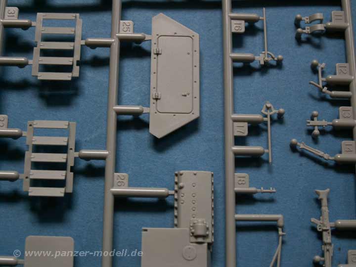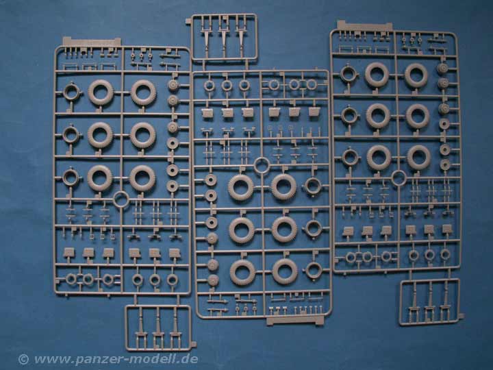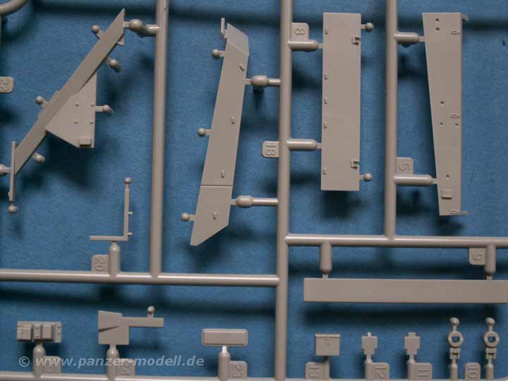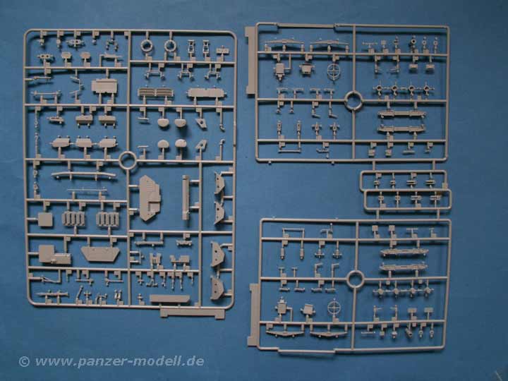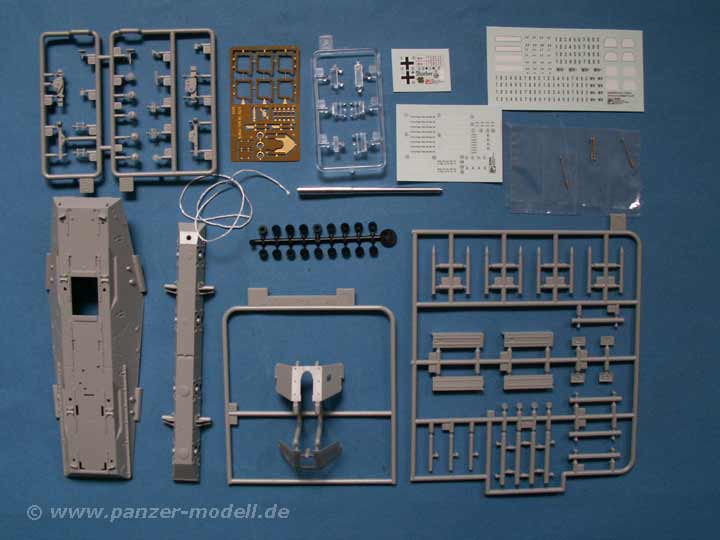 Der Bausatzkarton enthält etwa 570 Teile an 13 Spritzlingen. Das Grundmodell ist völlig neu aufgebaut worden von Dragon und entsprechend mit der schon bekannten 7,5cm PaK versehen worden. Neben den Spritzlingen erfreut uns die besagte Ober und Unterwanne, jeweils in einem Teil, sowie einem 7,5cm Alurohr, 4 Metallpeilstangen, PE Teilen, sowie Klarsichtteilen und 2 Decalbögen.