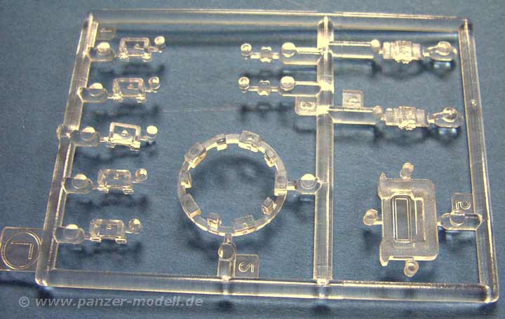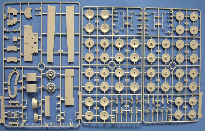 Ebenfalls sehr gut sind die Teile von Kühler und Lüfter, die in den Motorraum als Plastikteile eingebaut werden können und durch die Lüftergitter gut sichtbar sind! Ein weiterer Clou ist die Möglichkeit das Laufwerk mit funktionierender Drehstabfederung zu bauen. Schön ist eben die Möglichkeit dass der Modellbauer entscheiden kann ob er diese Option nutzen will, oder nicht, denn mit der verklebbaren Kette macht ein bewegliches Federungssystem wenig Sinn, es sei denn man hat eine bewegliche Einzelgliedkette.