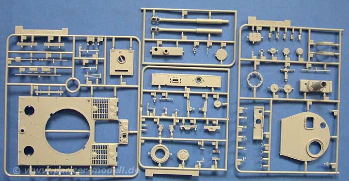 Der Karton erschlägt einen nahezu mit der Fülle an Material. Sämtliche Teile sind extrem gut und sehr schön detailiert ausgeführt. An allen wichtigen Stellen finden sich sehr gute und sauber dargestellte Schweissnähte, alle Plastikteile sind fein und detailiert. Dies zwar auf Kosten vieler Gießnasen, die man pro Teil entfernen muss, aber für DIE Qualität nimmt man gern etwas mehr Arbeit in Kauf.