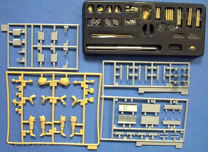 Was aber finden wir denn nun gebau in dem Bausatz? Insgesamt 742 Teile an über 20 Spritzlingen, dazu PE Teile, Draht, ein gedrehtes Metallrohr, gedrehte Metallmunition und leeren Hülsen, Abschleppschäkel aus Metall, Nebelwurfbecher aus Metall, einen komplett fertigen Eimer aus Metall, Klarsichtteile, 2 Figuren der Propagandakompanie in Weichplastik, usw.