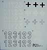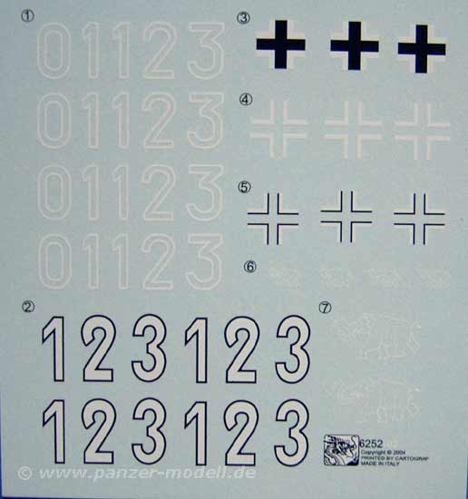 Die Bemalungsanleitung zeigt den Tiger "100" in einfach grau und Tiger "121" in zweifarbtarn weiss/feldgrau. Die Abziehbilder sehen qualitativ sehr gut aus und beinhalten drei Varianten des Balkenkreuzes, das Einheitenabzeichen der 501., den Elefanten, sowie viermal die '0', '2' und '3', sowie achtmal die '1' als weisse outline Turmnummern und zwei Sets der Zahlen 1, 2 und 3 als weisse mit schwarzem outline.